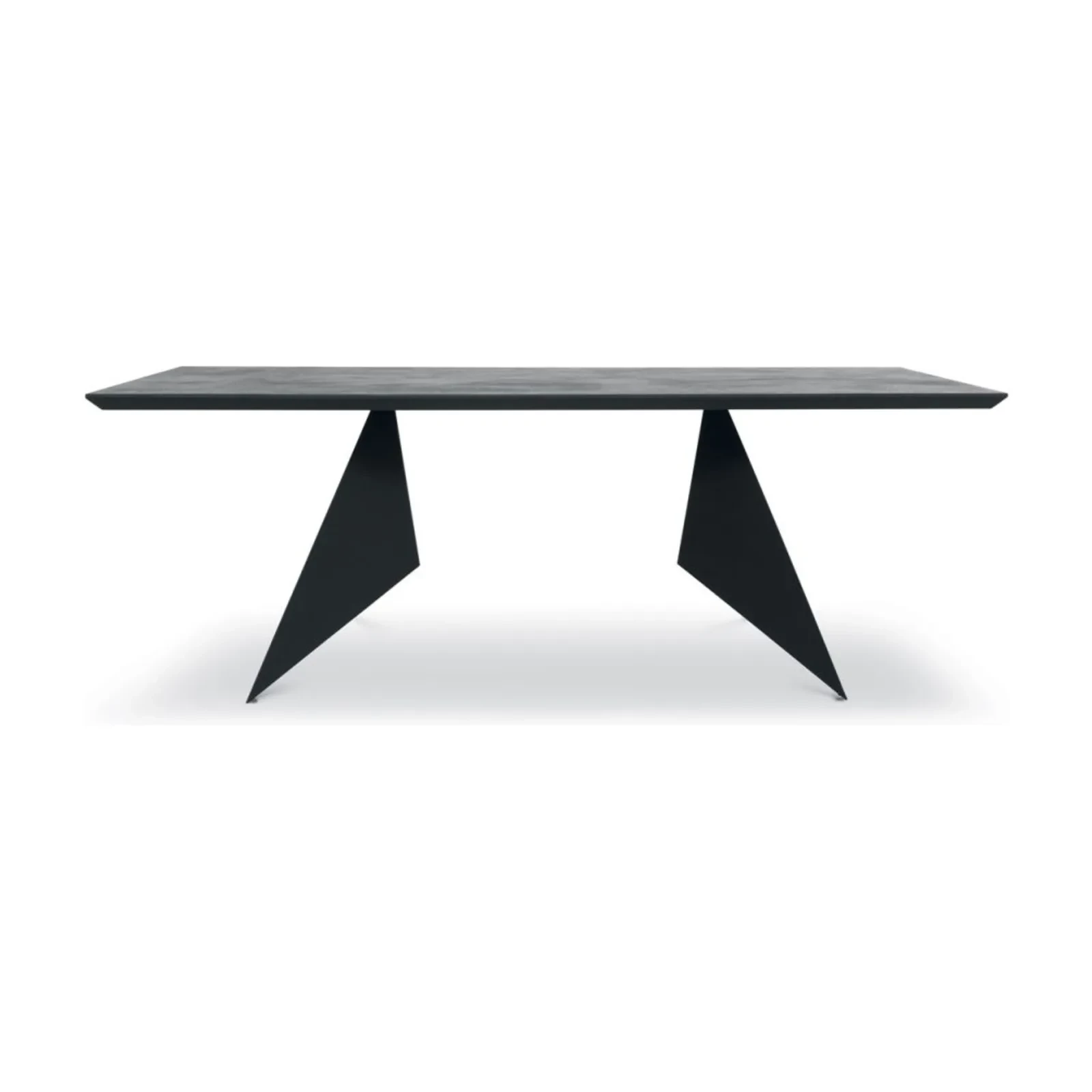 The Vela dining table is all about balance in every detail. Its slender, folded metal legs support the tabletop as if it were floating in space. This dining table comes with a painted metal base, and is available with a rectangular or curved top in ceramic, printed glass, or ash wood (ash option available only for curved tops).