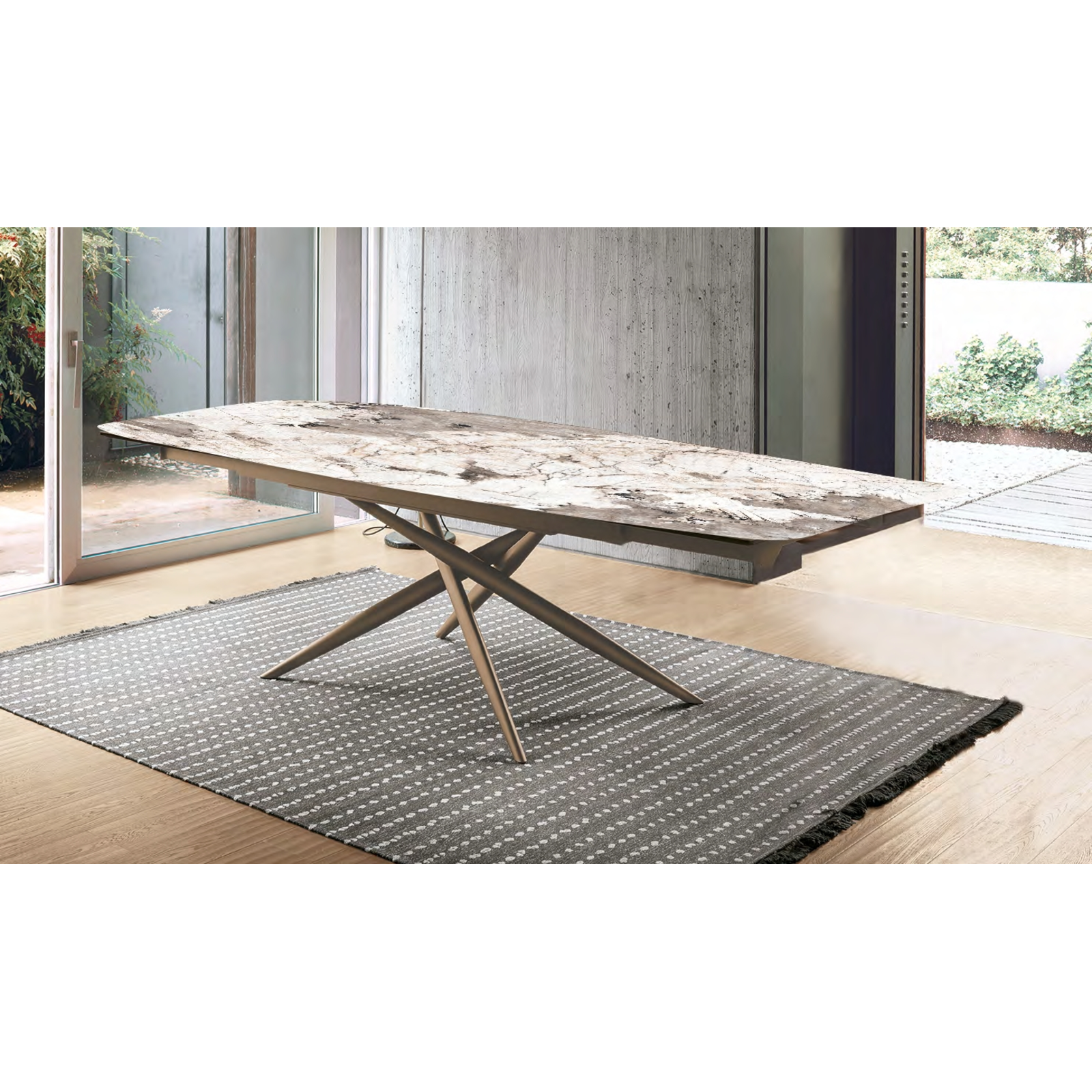 The elegance of the Chantal dining table lies in its refined elliptical, tapered legs, which intersect to support the tabletop. This extendable table is made with a painted bronze-colored metal base, and the curved top can be ordered with the popular Patagonia Tundra ceramic surface.
