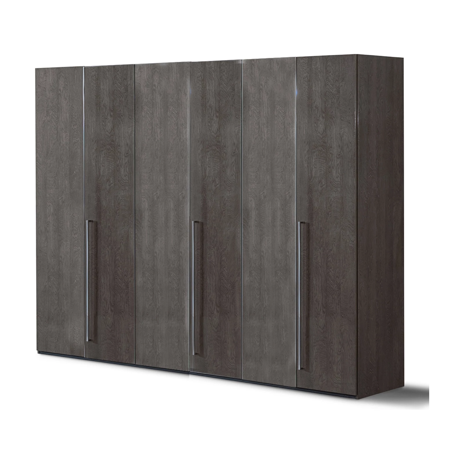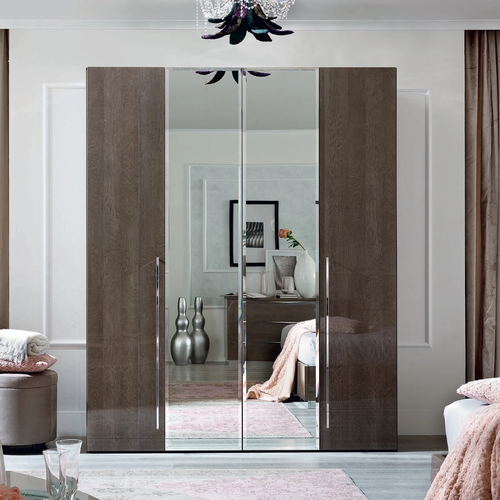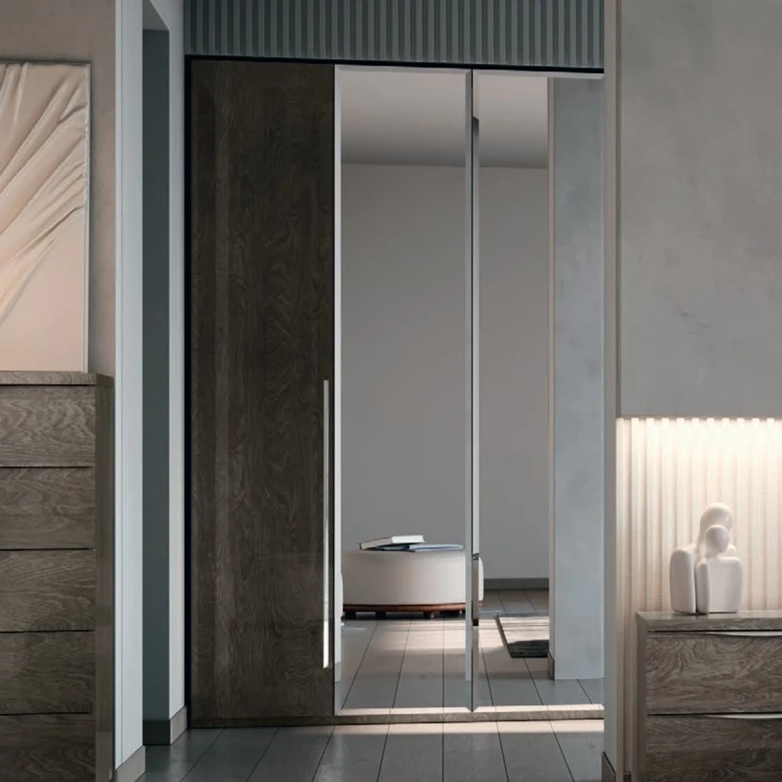 Modern Italian wardrobe available in 2-, 3-, 4-, 5-, or 6-door configurations. Offered with wood or mirrored doors in birch or silver birch finishes. Effortless elegance and premium functionality, with a variety of optional accessories.