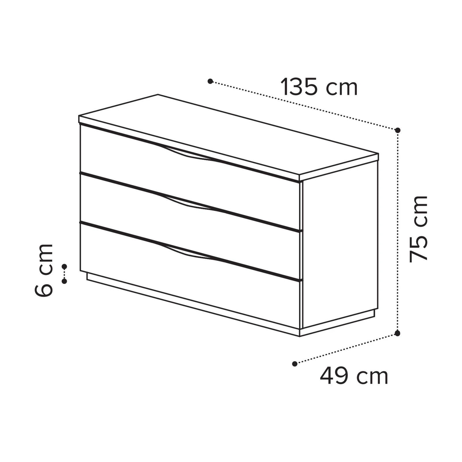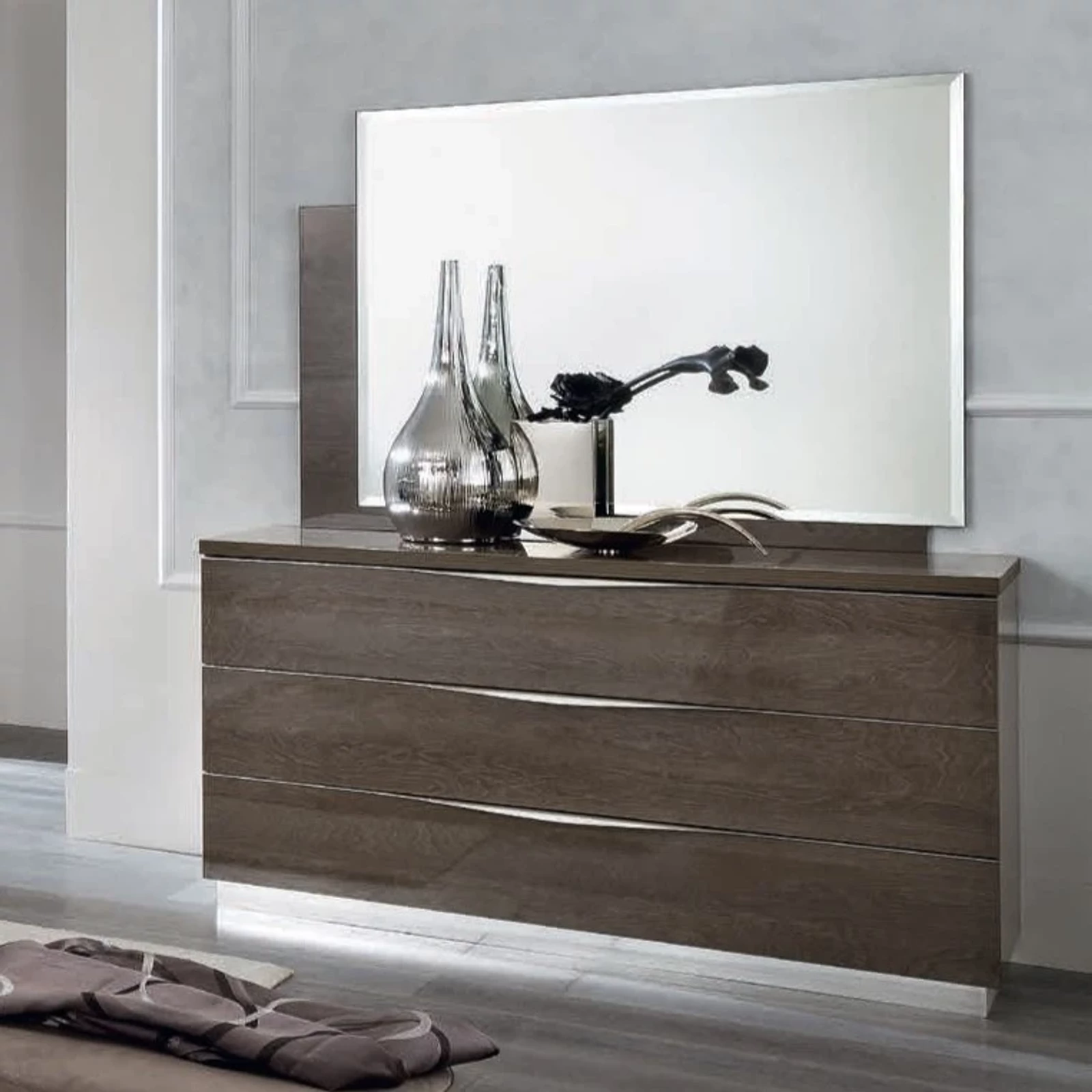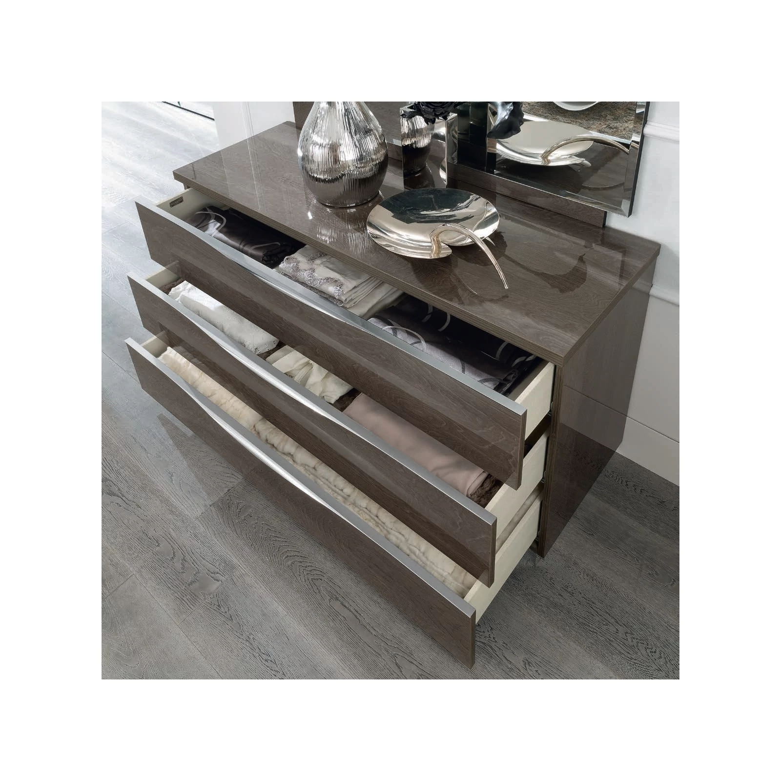 This modern Italian chest of drawers, with three spacious drawers, helps with organization and makes daily routines easier. Available in birch finish with curved champagne-colored handles or in silver birch finish with silver-colored decorative elements.