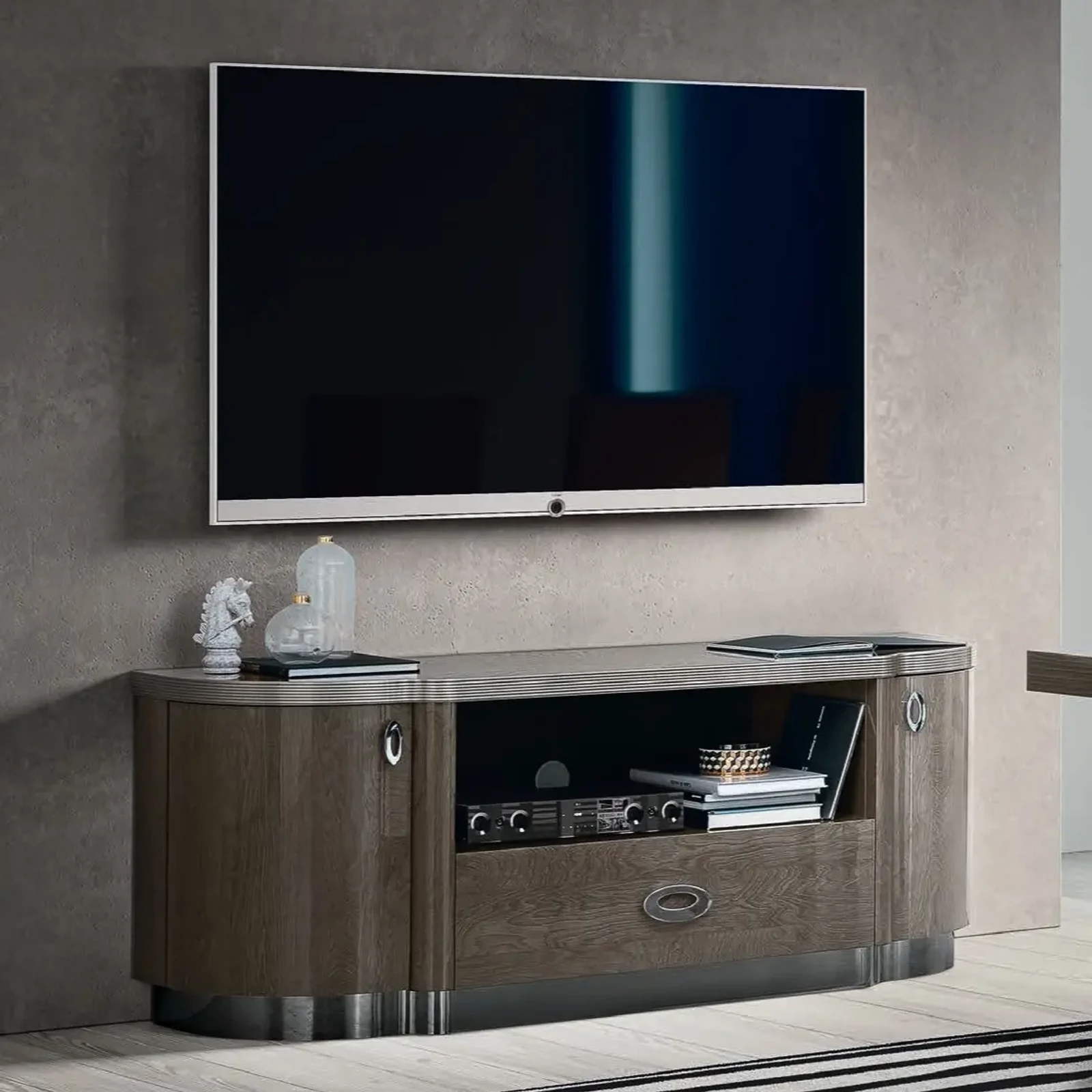 The Armonia TV cabinet's distinctive curved lines and luxurious design combine elegance with practical functionality. An ideal choice for storing your multimedia devices.