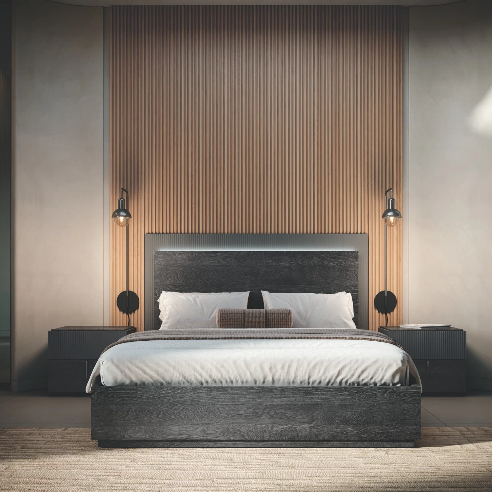 Discover the modern and elegant world of the CamelGroup Onyx bedroom, offering a combination of the latest trends and materials. The furniture's black surfaces, interspersed with bluish accents (Mediterranean blue) are in harmonious balance with the grooved cannetè details. The clean lines and unique material use of the Onyx bed make it a perfect choice for modern bedrooms. The Soft model, with its soft, velvety padding, elevates comfort to the next level, and its triple-layered headboard becomes a stylish centerpiece in your bedroom. The Onyx modular wardrobes are available in different sizes, with or without mirrored doors, allowing you to design the space according to your taste. The top drawer fronts of the nightstands and dressers harmonize with the collection's cannetè details, while the lower drawers can be opened with stylish stiletto handles.