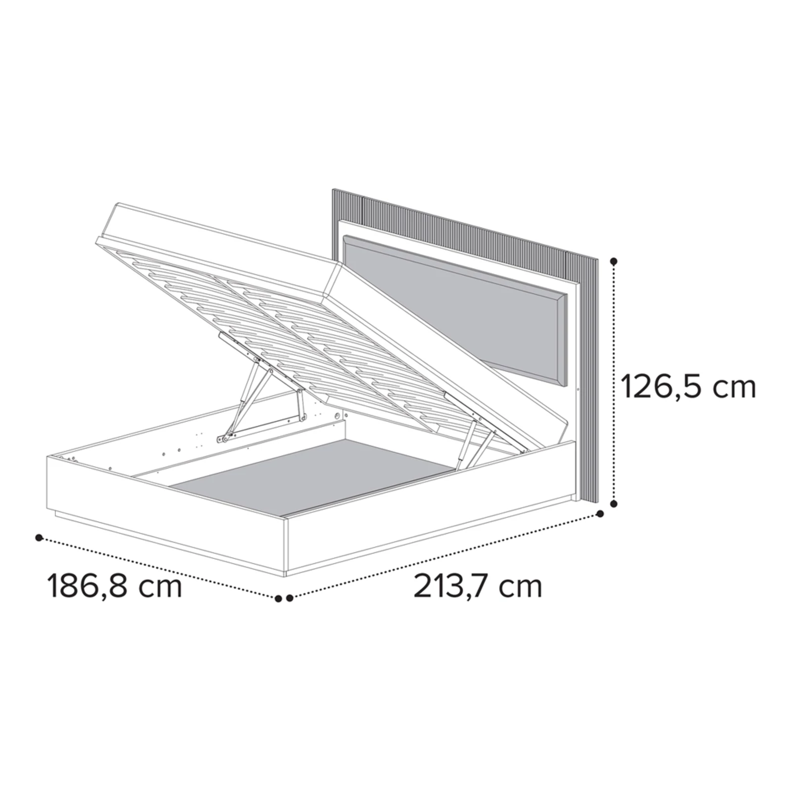 - 160x200 cm version: 186,8×213,7×126,5 cm
