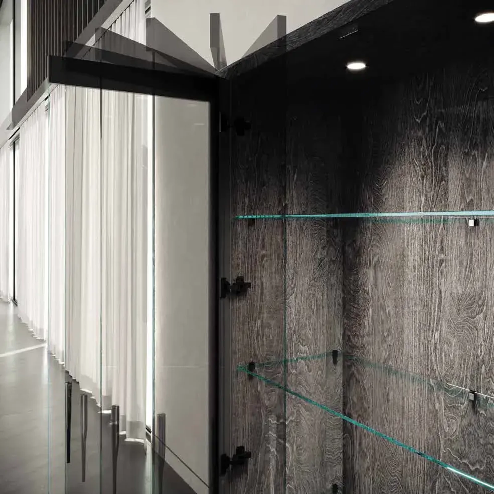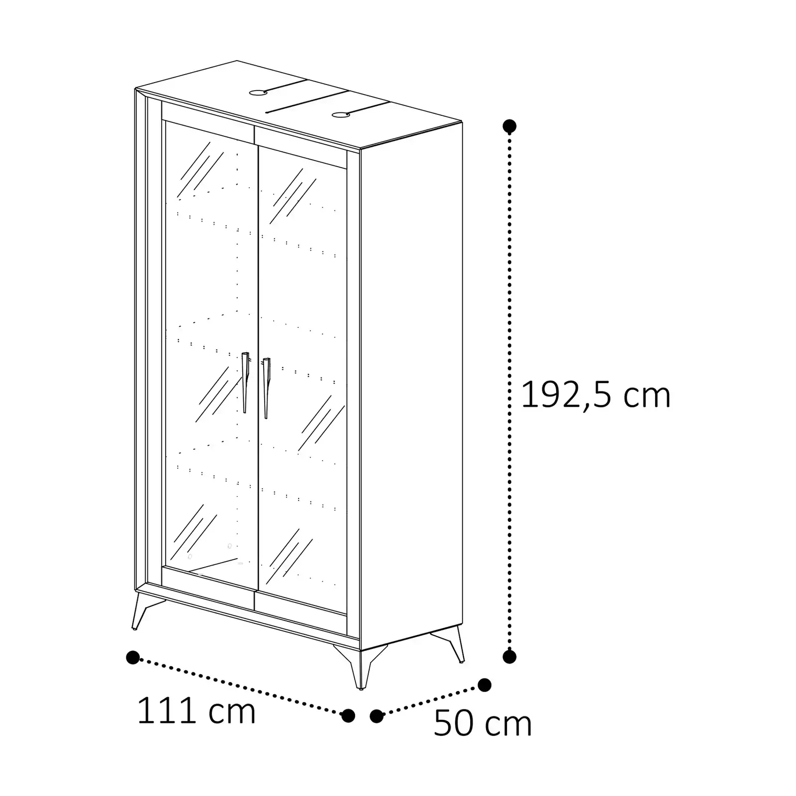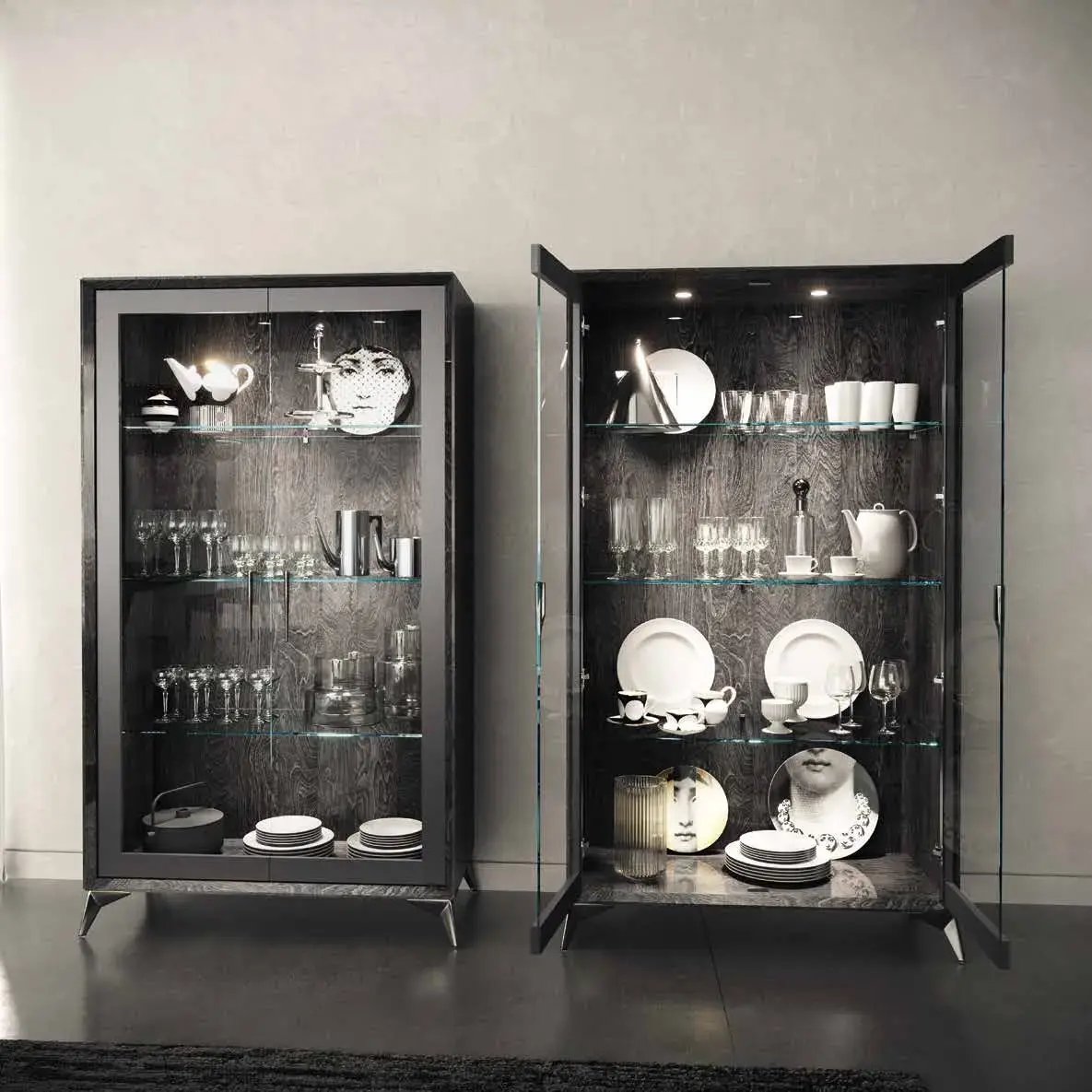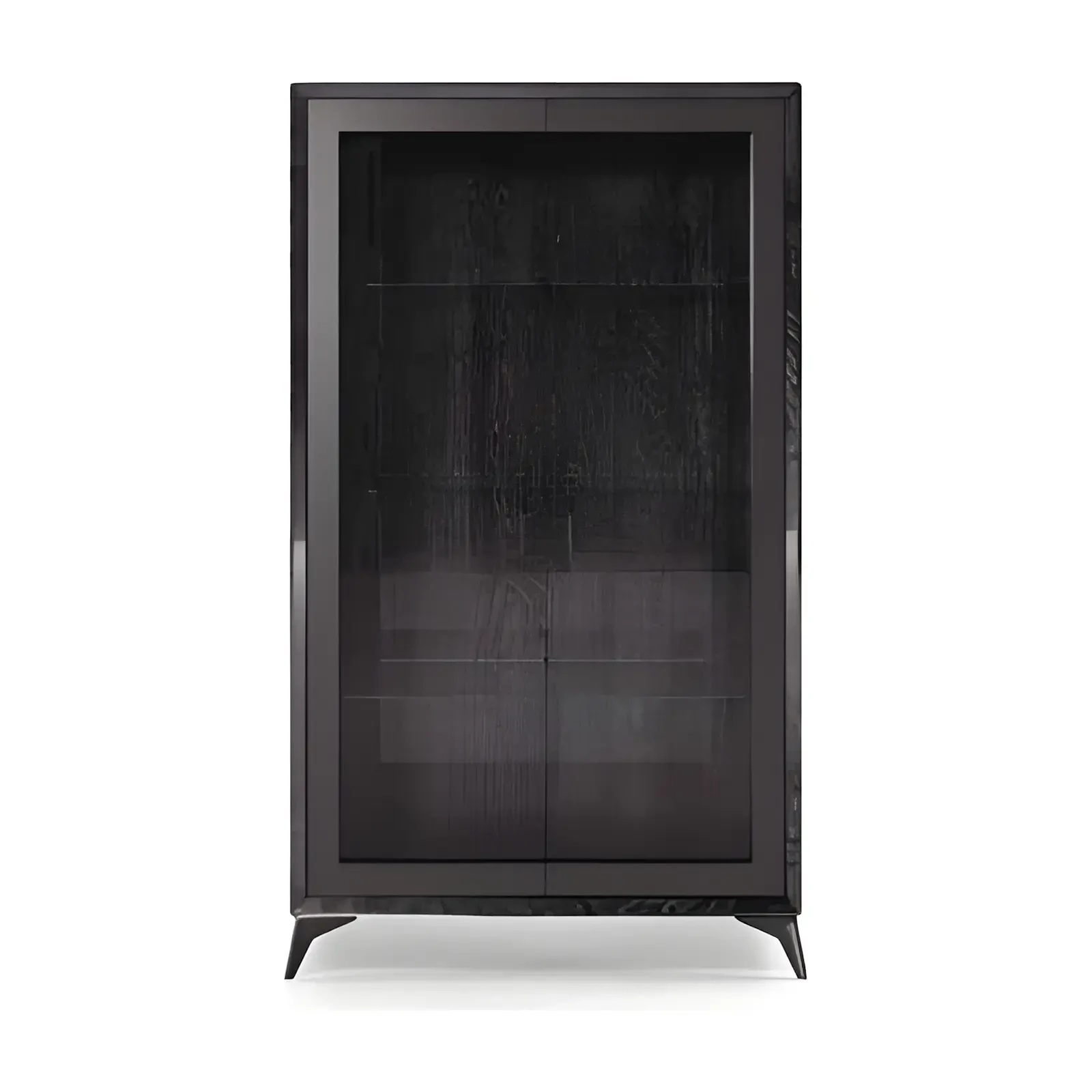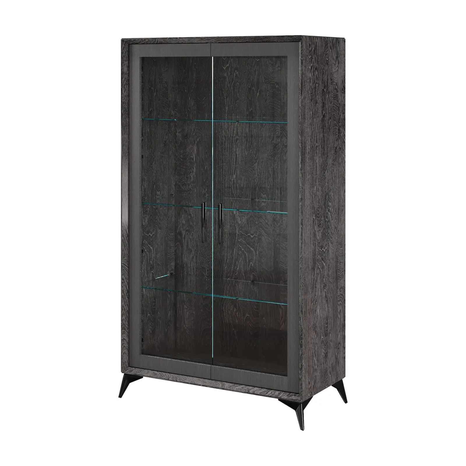 Enhance your home with the Krystal glass display cabinet featuring dimmable LED lighting and a soft-touch switch. Its sleek black and metallic matte finishes with the unique stiletto handles make it a modern centerpiece.