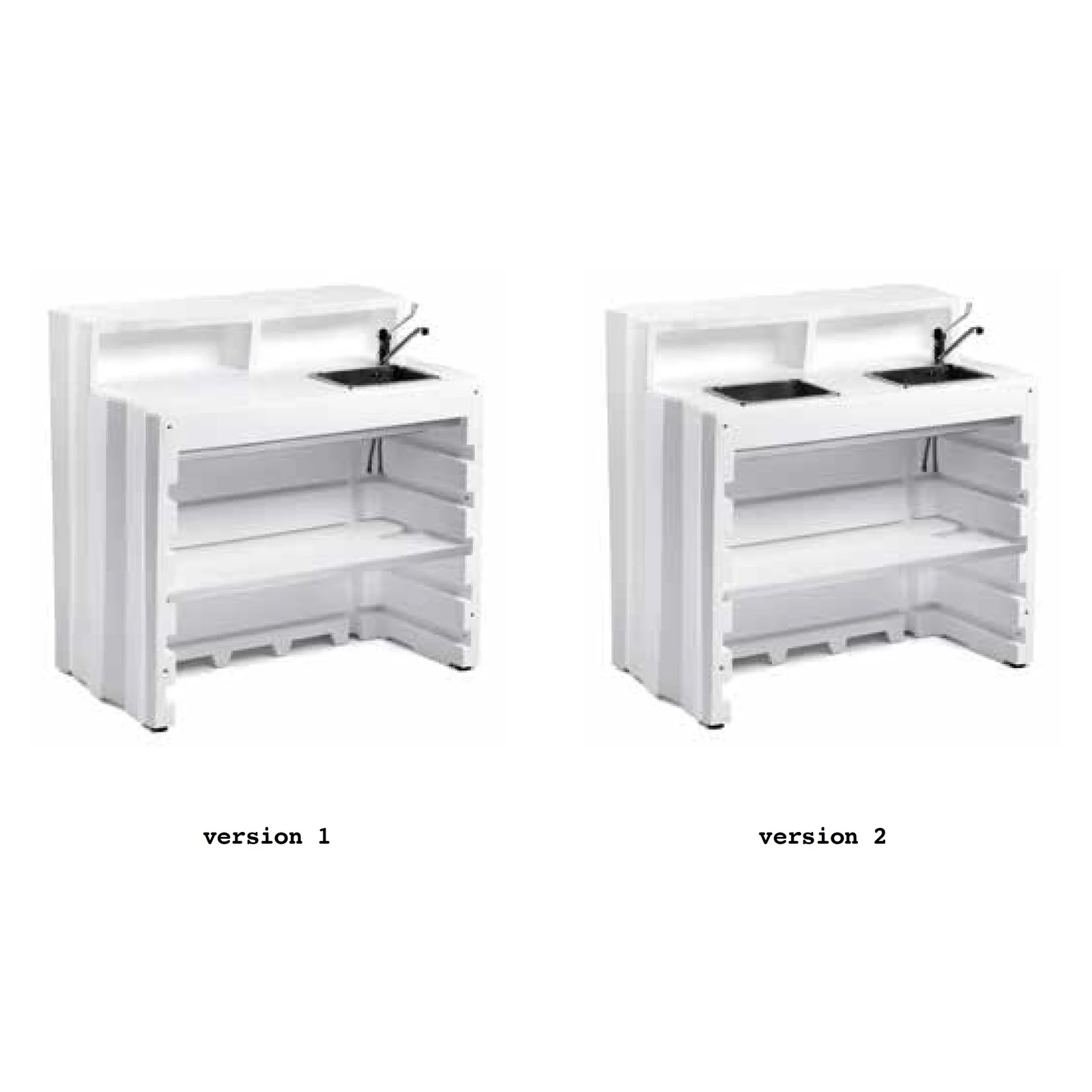 This modular bar counter is available in two depths to provide a larger worktop where to place the coffee machine or other similar appliances. The lower compartment can house cold storage units and built-in appliances. The distinctive faceted surface "covers" the joints between the modules allowing for uniform and consistent combinations. The "Frozen" counter is suitable for indoor and outdoor use, it is also available in the luminous version and is equipped with a full range of bar accessories.