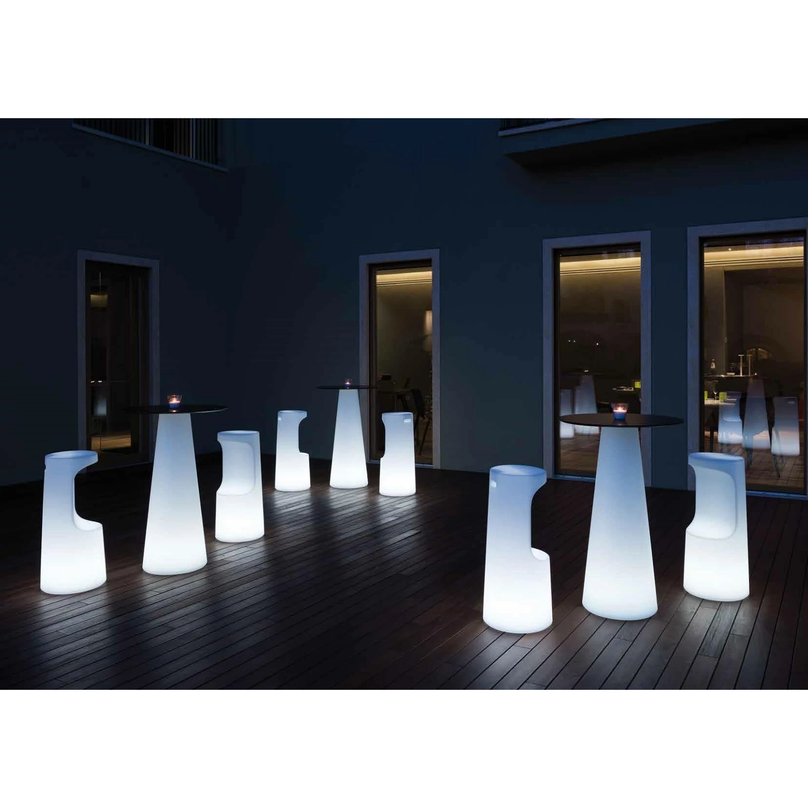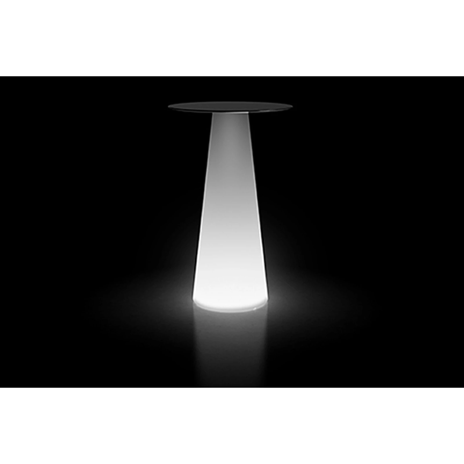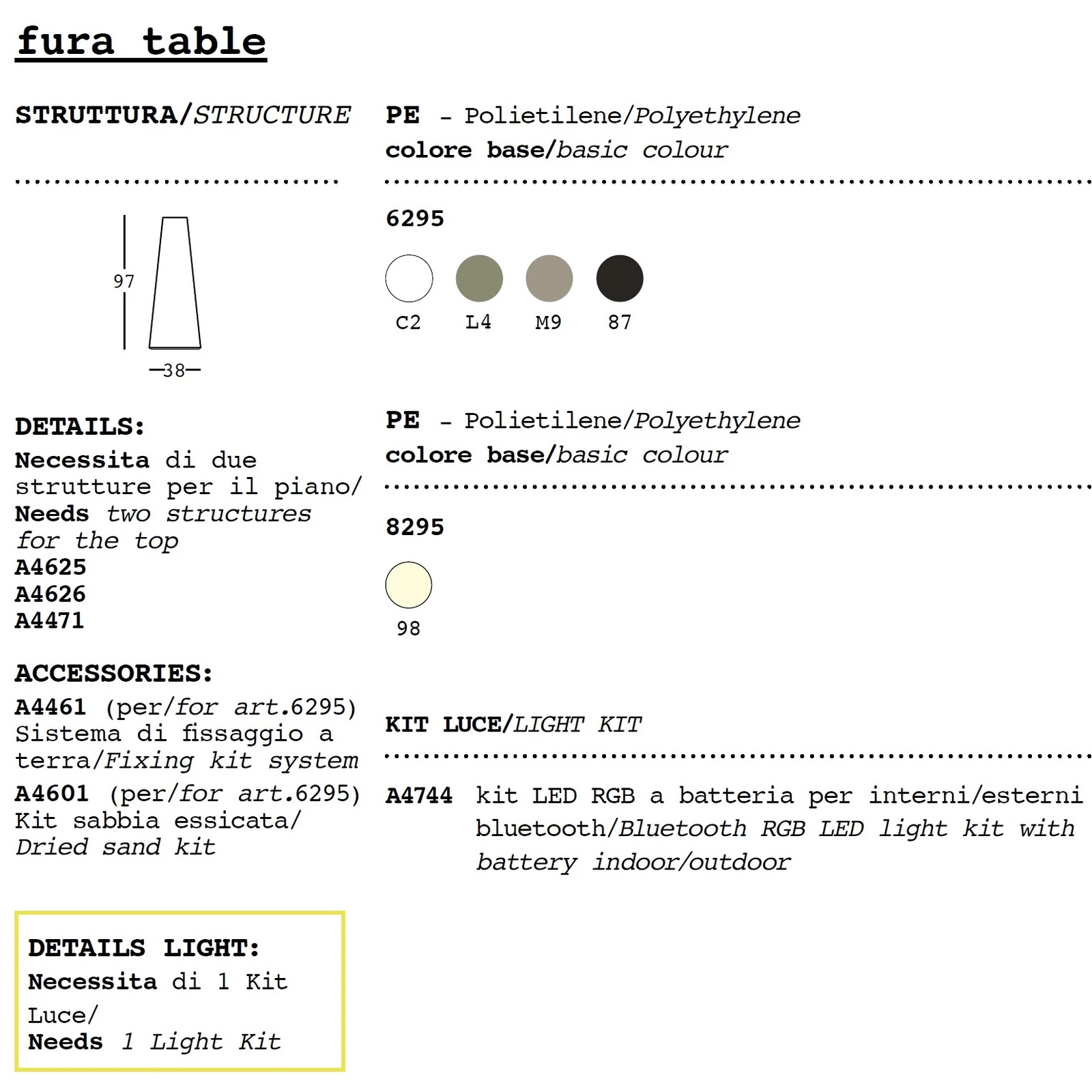 Table matched with the "Fura Stool". Its conical base gives it extra stability and the HPL tabletop makes it durable and easy to clean. Suitable for any indoor and outdoor environment. In luminous version is versatile and adapts to any style and taste, thanks to the battery-powered LED lighting kit, which eliminates the need for power cords and makes every element independent.