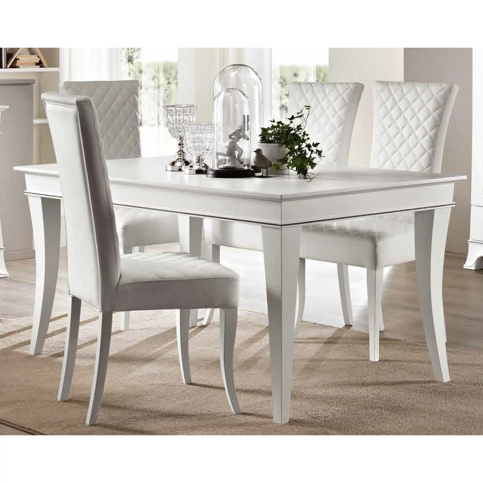The table with refined and simple lines is highlighted by the uniquely comfortable, softly stitched armchairs that surround it. The cabinet and the showcase have more classic tones, but both fit perfectly with more modern furniture.