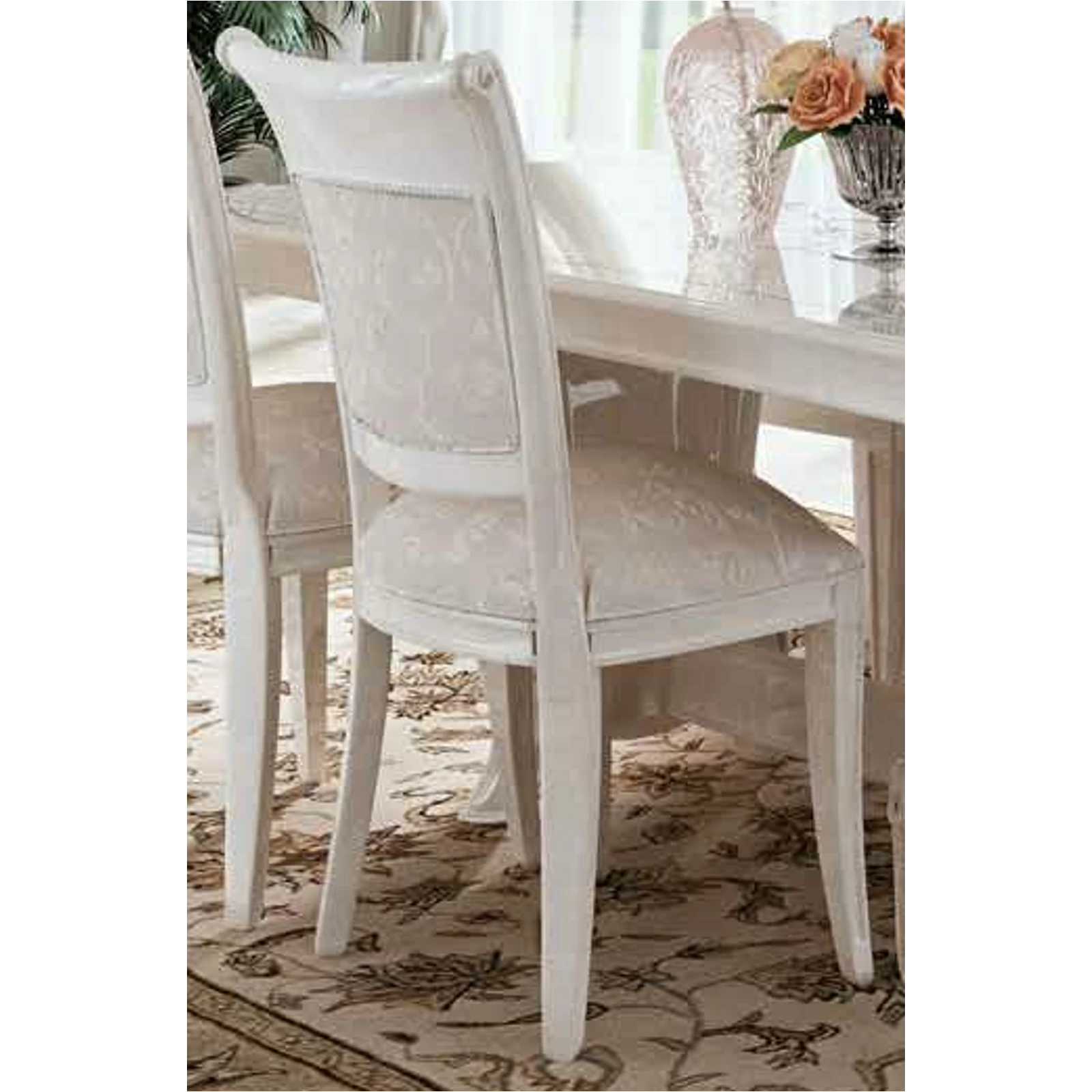 The base tone changes evenly from light to white. Cabinet doors are adorned with vibrant shapes and natural-looking lines, and the center of the cabinet and table legs are enriched with carvings.