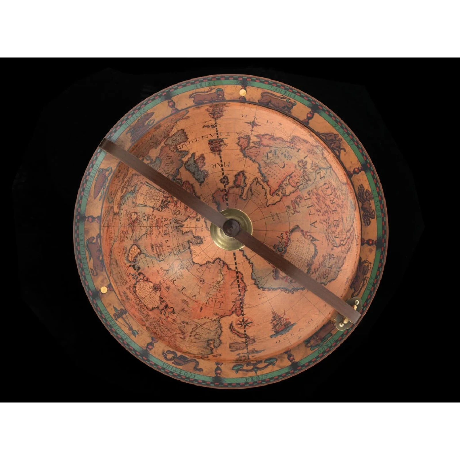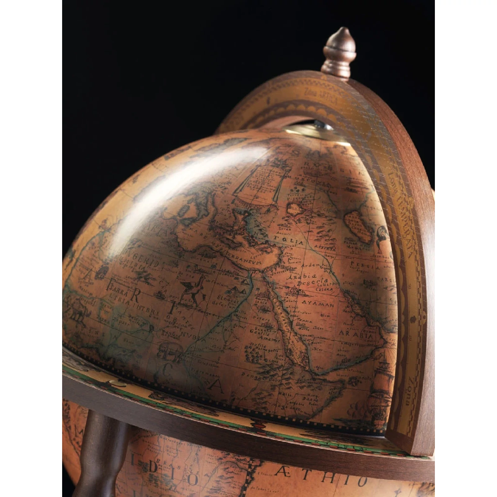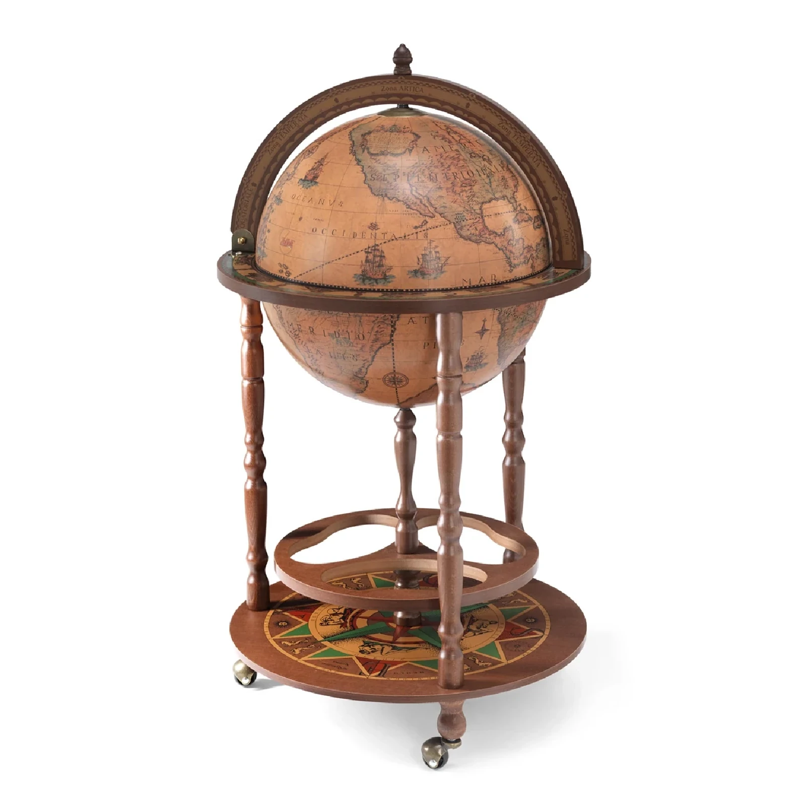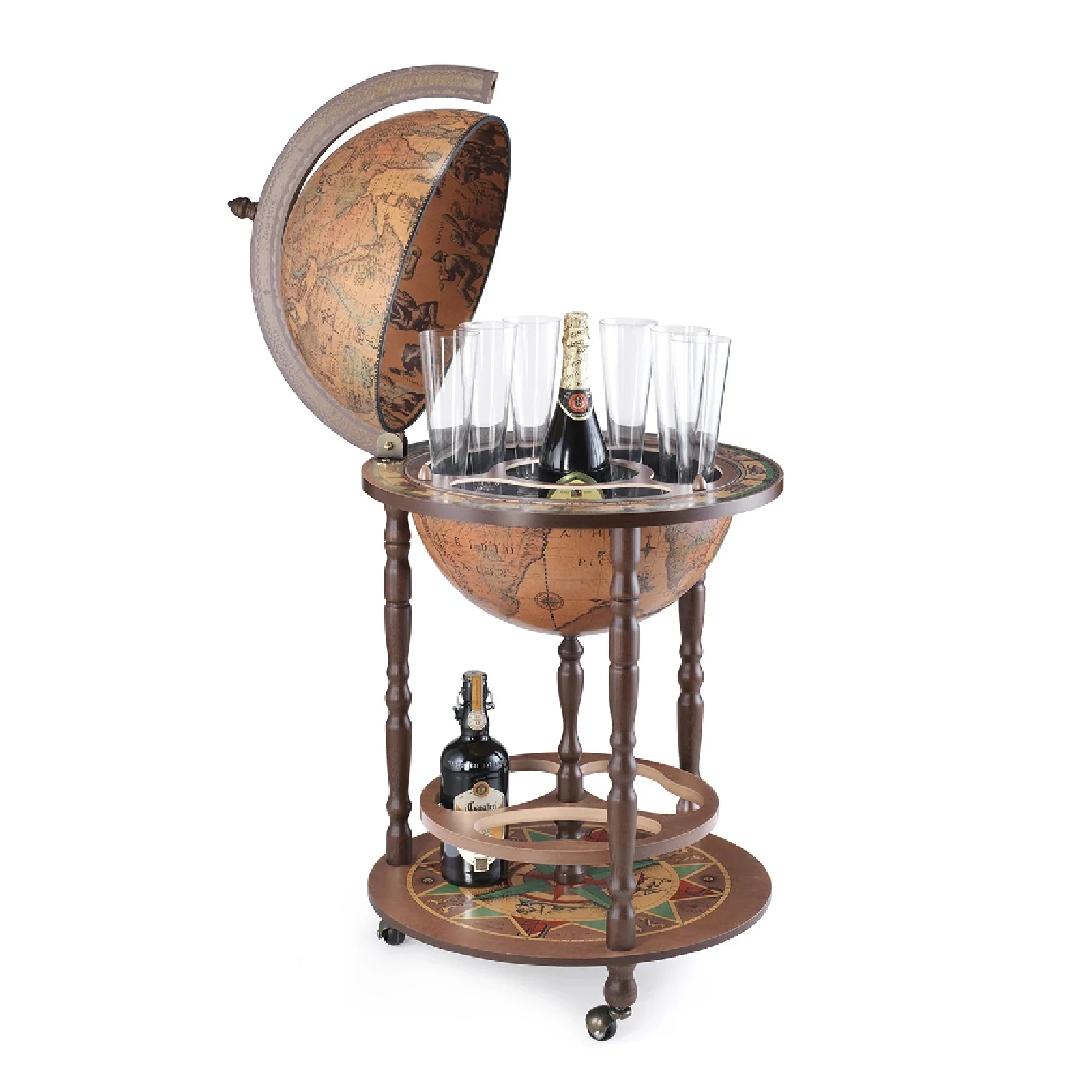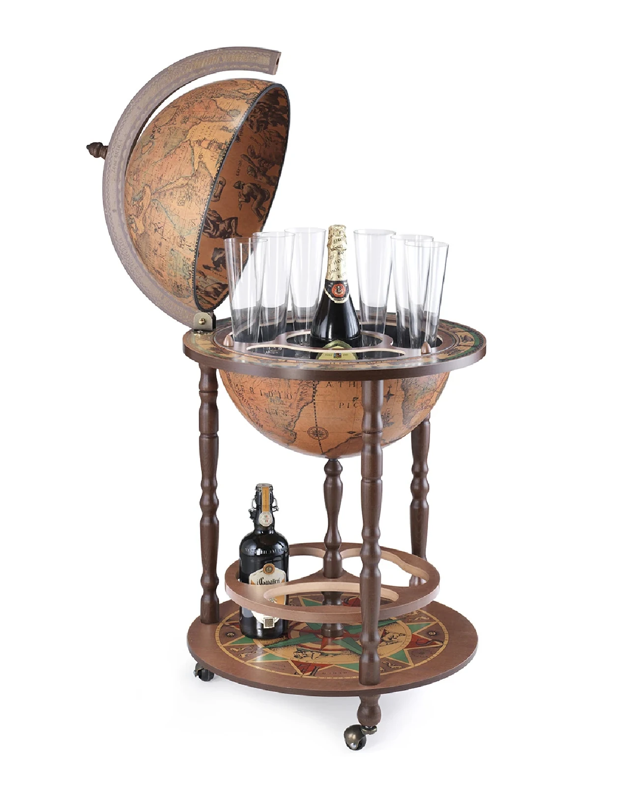 Our most popular bar globe can store up to 9 glasses and 2 or 3 bottles inside its antique 16th Century southern sphere. Suitable for both large and small spaces, this finely detailed bar globe will add a classic twist to your home. Chestnut-stained solid hardwood legs and a beautifully illustrated lower-base shelf compose the stand. The globe sphere fully rotates around its meridian either when it is open or closed. You can easily move it thanks to its casters.