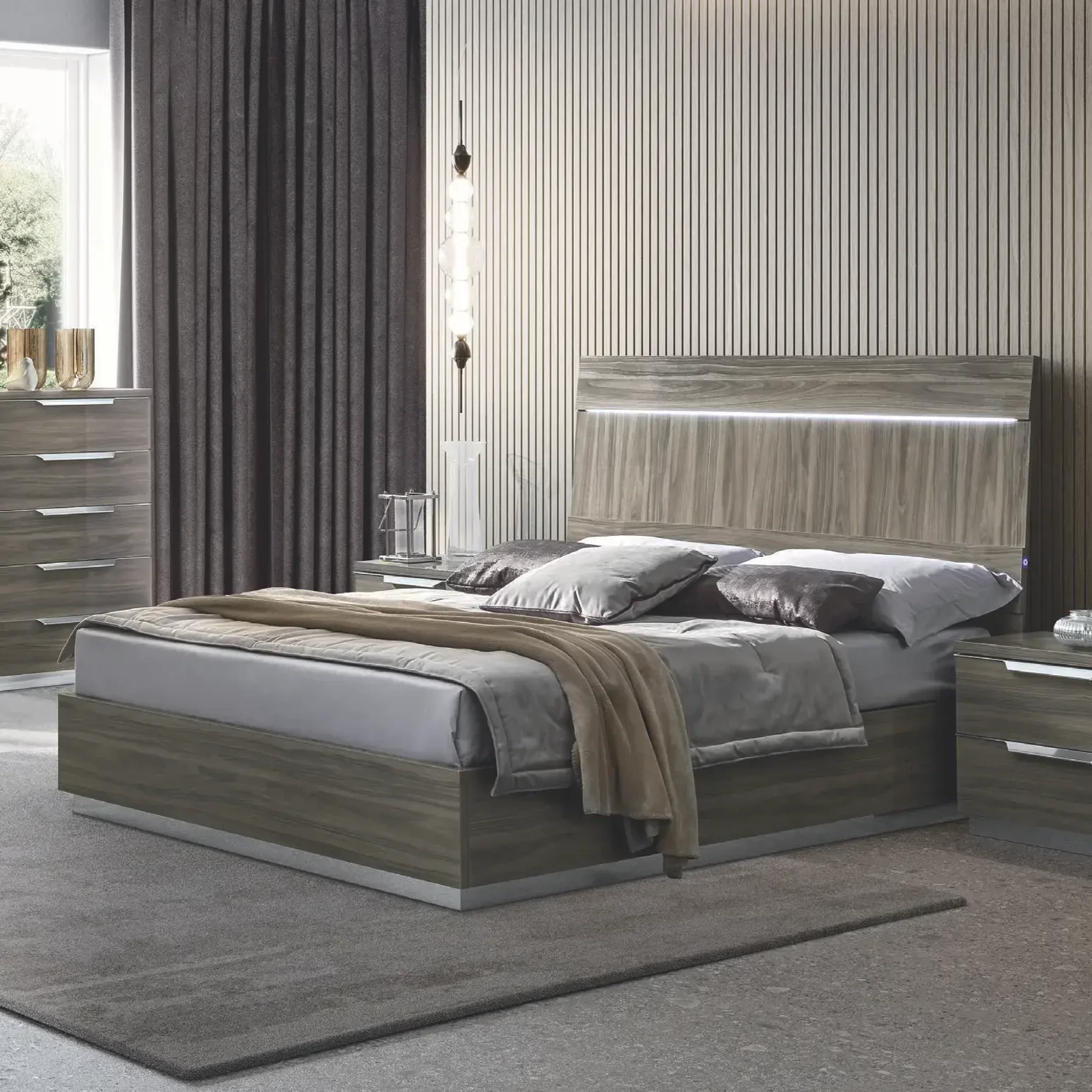 The Italian Kroma bedroom collection, designed by experts at CamelGroup, lends modern elegance to any bedroom with its exclusive colors. Featuring trapezium-shaped, brushed aluminum handles that create a striking contrast, the collection is available in two exclusive finishes – Venetian Grey and Silver Birch. The headboard’s simple yet refined design highlights horizontal and vertical patterns with varying panel thicknesses, enhanced by an adjustable LED light strip for added ambiance. The modular wardrobes offer a wide range of customization with optional accessories for a tailored storage experience. Night tables and dressers are crafted with 30mm thick tops and soft, smooth edges, while anti-scratch interiors ensure long-lasting quality.