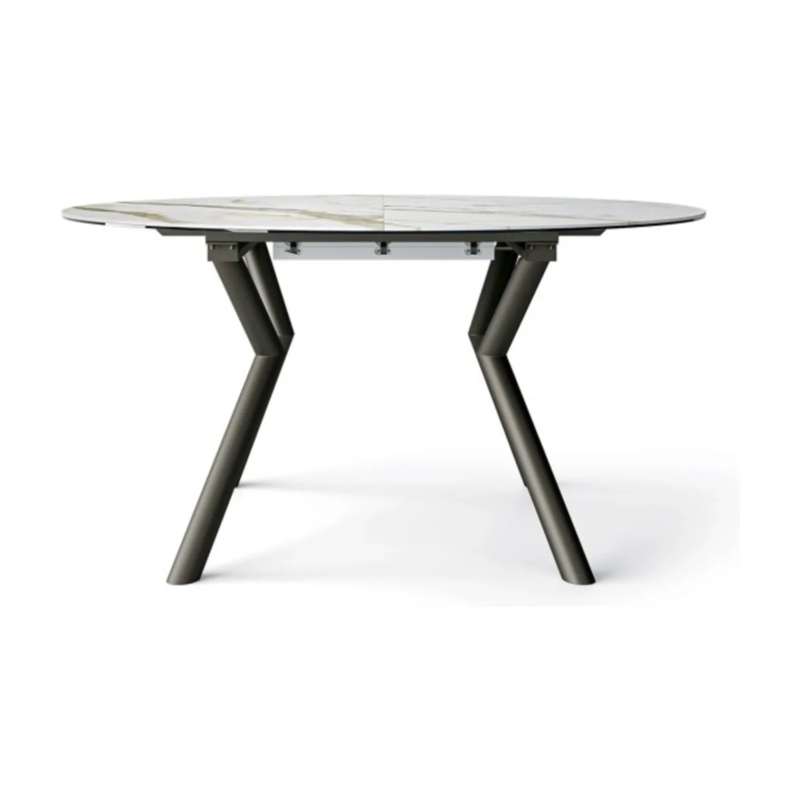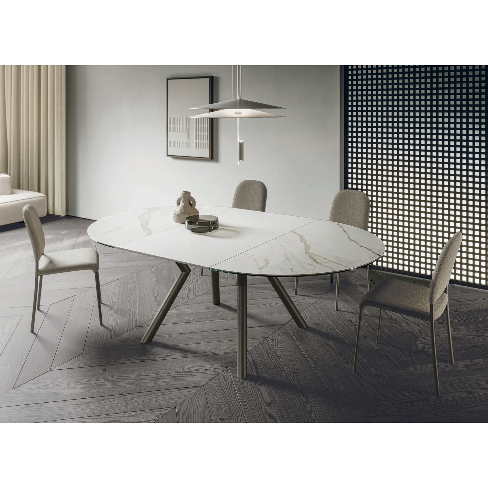 The Oliver dining table's specialty is its distinctive, dynamic design, which lends a unique aesthetic to any interior. This extendable table is made with a round tabletop, painted metal base, and operates with the innovative Easy Book System mechanism. The tabletop can be ordered in textured matte or ceramic finishes.
