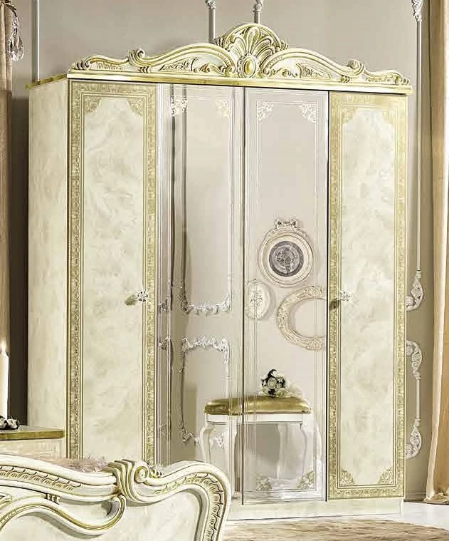 The Leonardo bedroom was born as the master combination of baroque and classic style, and it delivers the feeling of the luxurious palaces of the 1600s to your home. The glittering gold decorations placed on the high-gloss beige surface are highlighted by arabesque lines and art déco style handles and details. It's the perfect choice if you like the immortality of classic style!