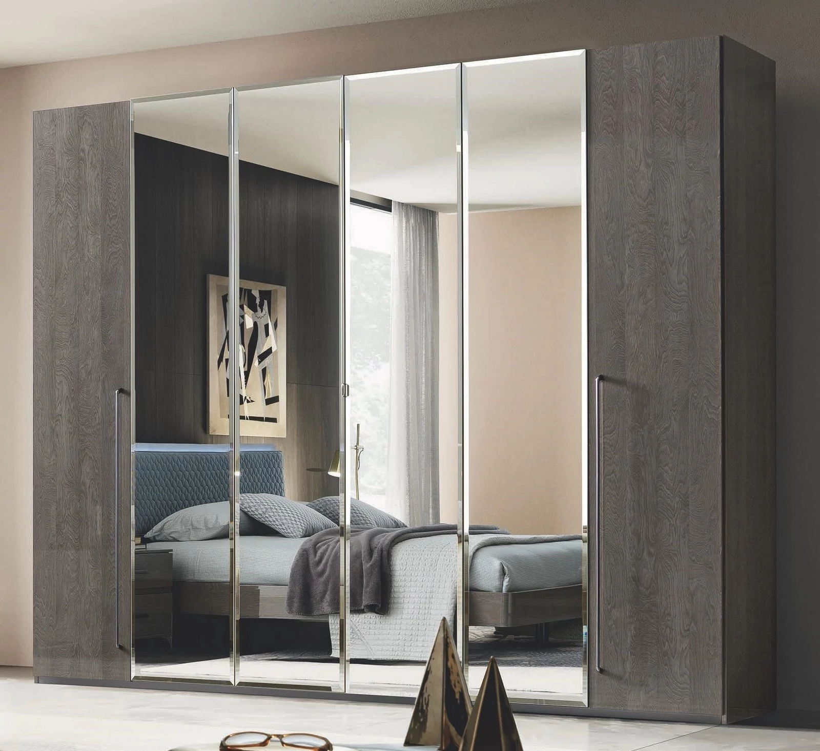 Maia 6-doors cabinet, with 4 mirrored doors with MILANO shiny chrome handle - silver birch