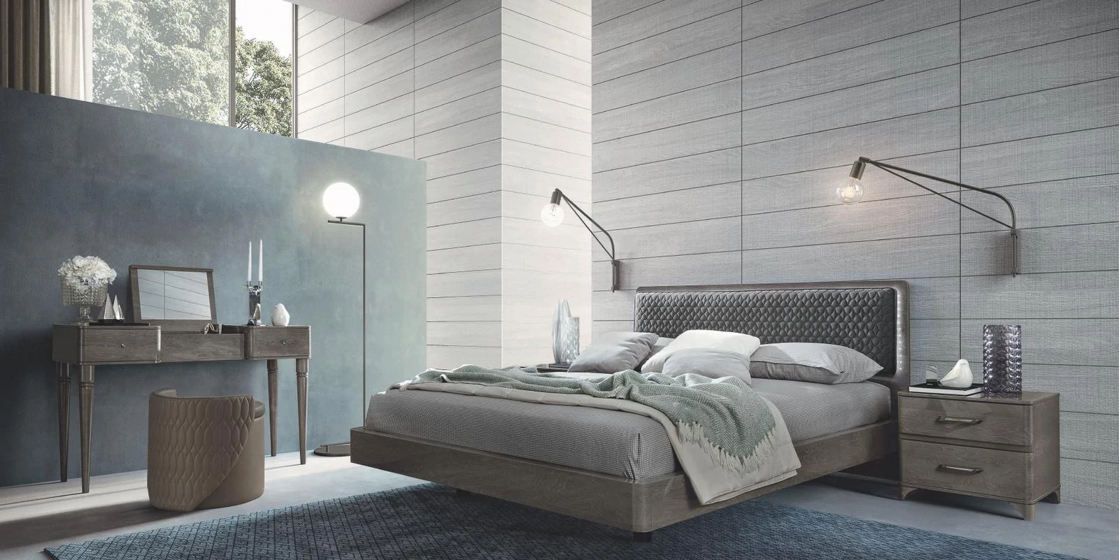 19mm thick mdf (medium density fibreboard) panels (camelgroup exclusive). High gloss polyester lacquer with anti-yellowing treatment with uv (ultra violet) drying process. Rombi version with rhomb-shaped padding and stitiching on eco nabuk material. Led lights 110-250vac on aluminum profile and satin opal screen.