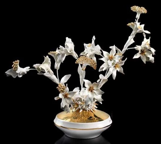 Modern ceramic vase with flowers. Color: white, gold.