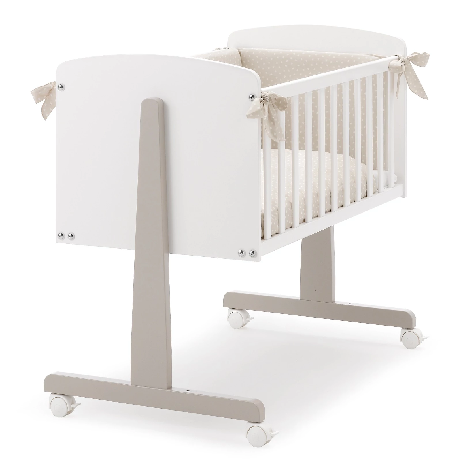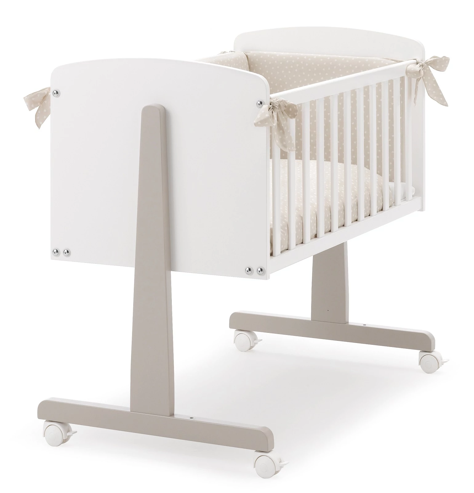 If you remove the top bolts of the crib and lower the grid, you can adjust and fix the crib easily to the bed thanks to the safety harnesses and the four braked wheels, so the baby can sleep together with his/her parents.
