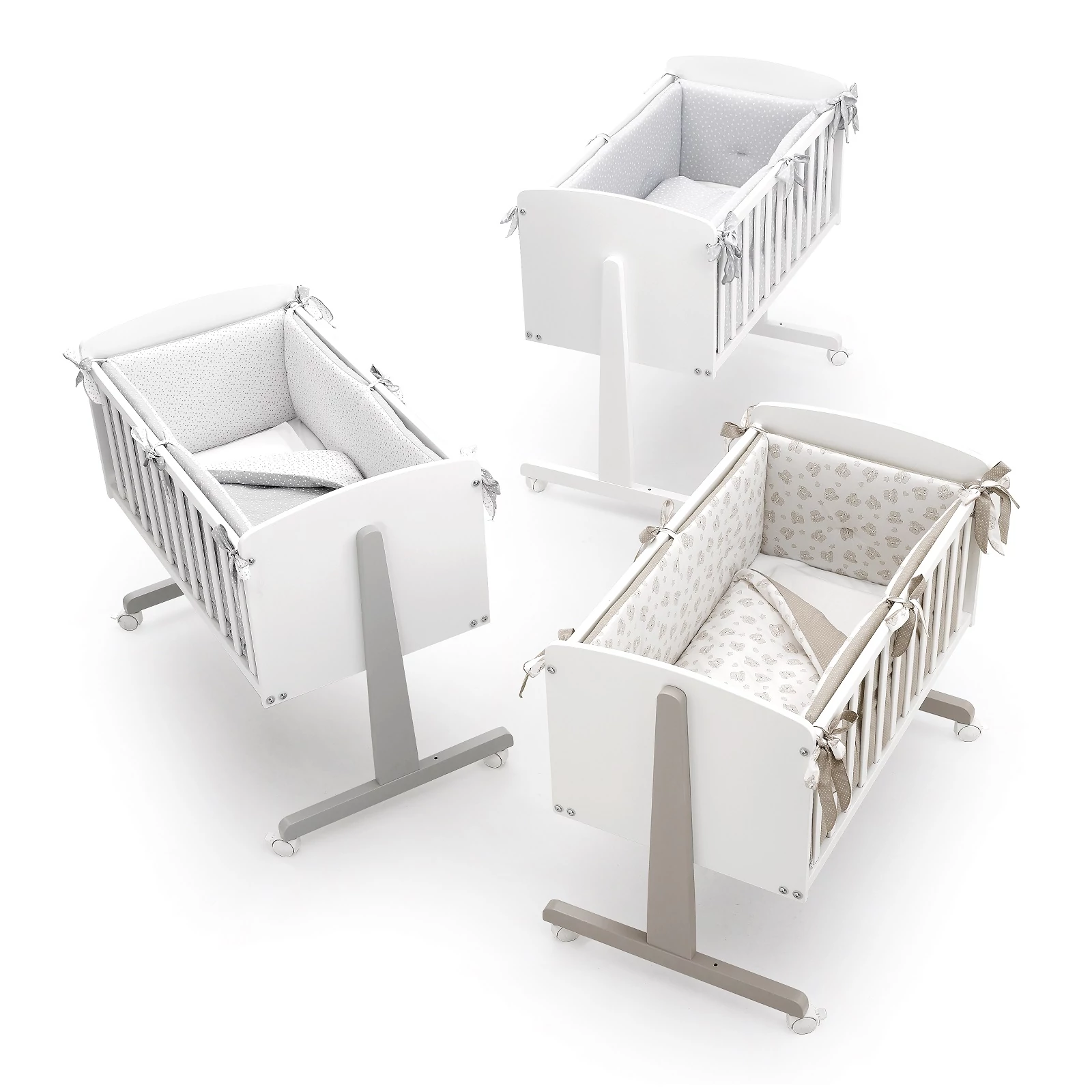 Thanks to the 5 different heights it can be adjusted to any type of bed. The legs of the crib have inner fixing elements so they don't have holes or bolts on them, and this contributes to the sophisticated and discrete design of the furniture.