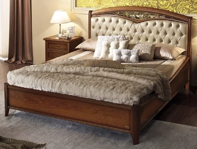 Nostalgia Double bedstead with bedding container - 160x200 cm, with curved side, with metal-insert decorative frame with curved headboard and capitonné padding, with short footboard, walnut