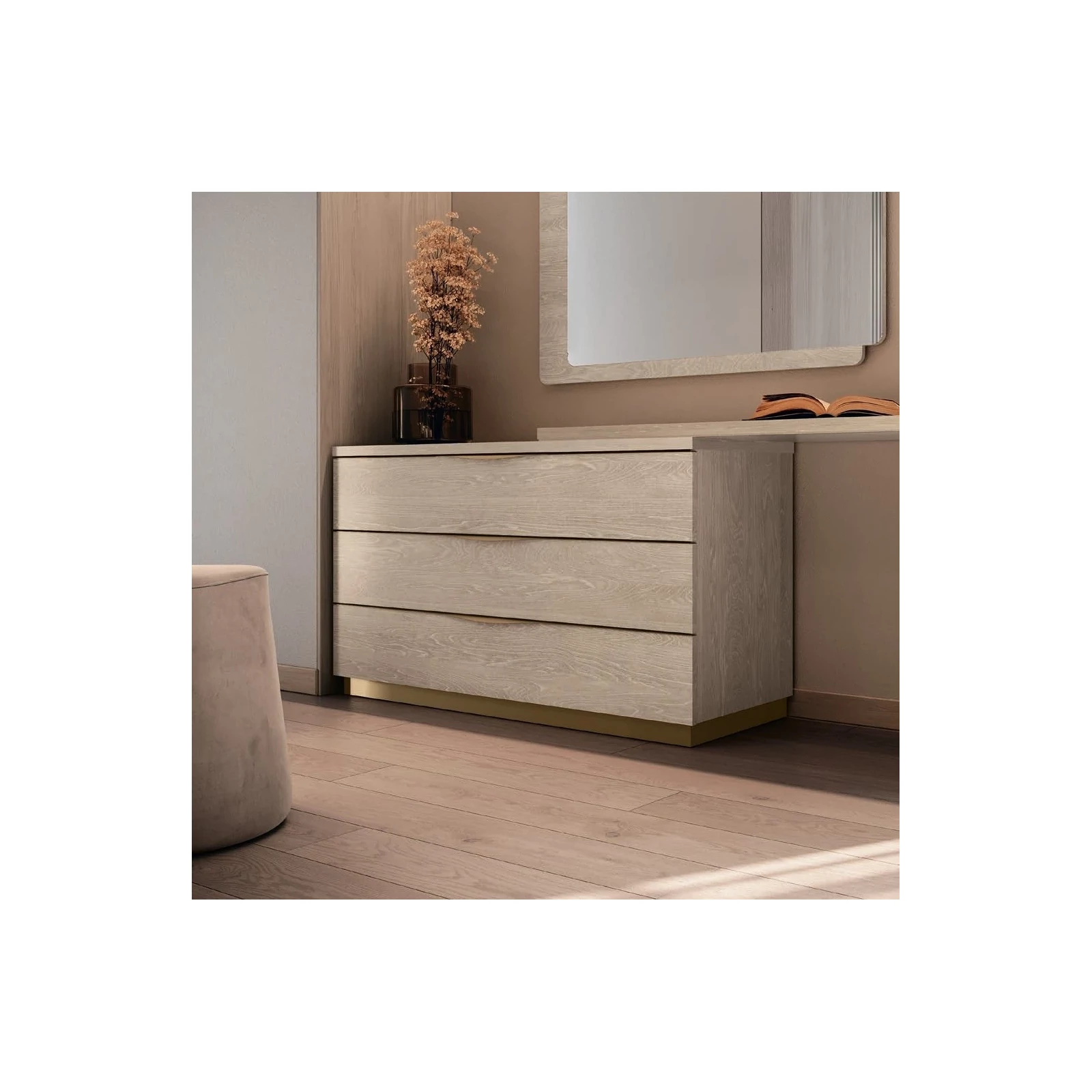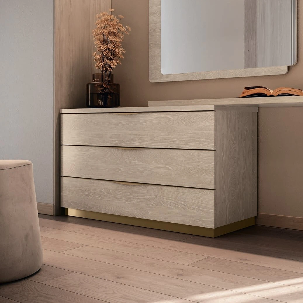 This modern Italian chest of drawers, with three spacious drawers, helps with organization and makes daily routines easier. Available in birch finish with curved champagne-colored handles or in silver birch finish with silver-colored decorative elements.