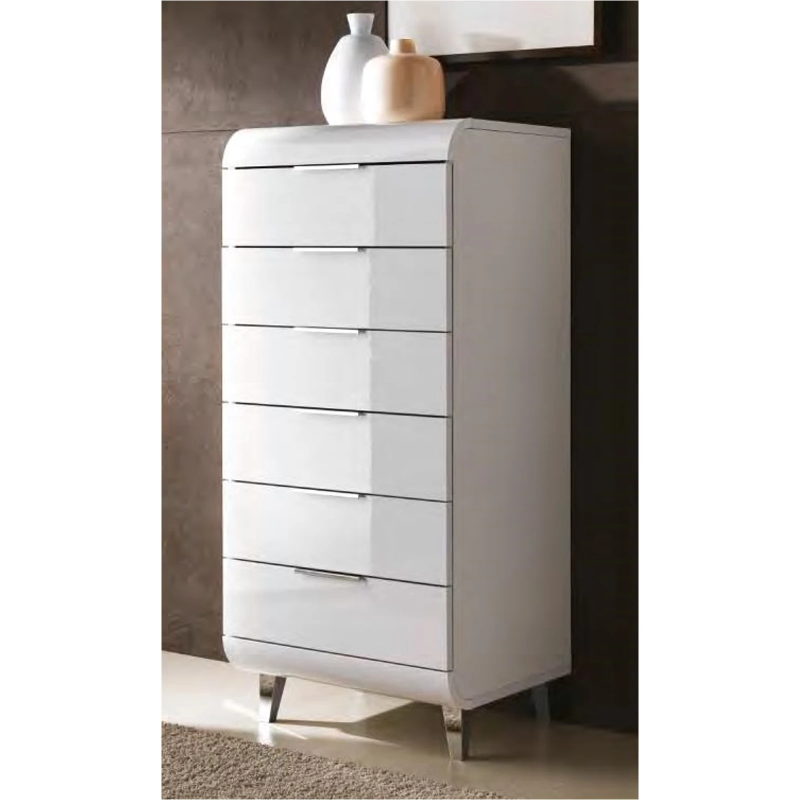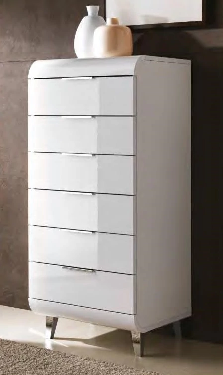 The combination of glossy white finish and chrome legs creates a striking visual effect while allowing the tallboy to blend seamlessly with other modern furniture pieces.