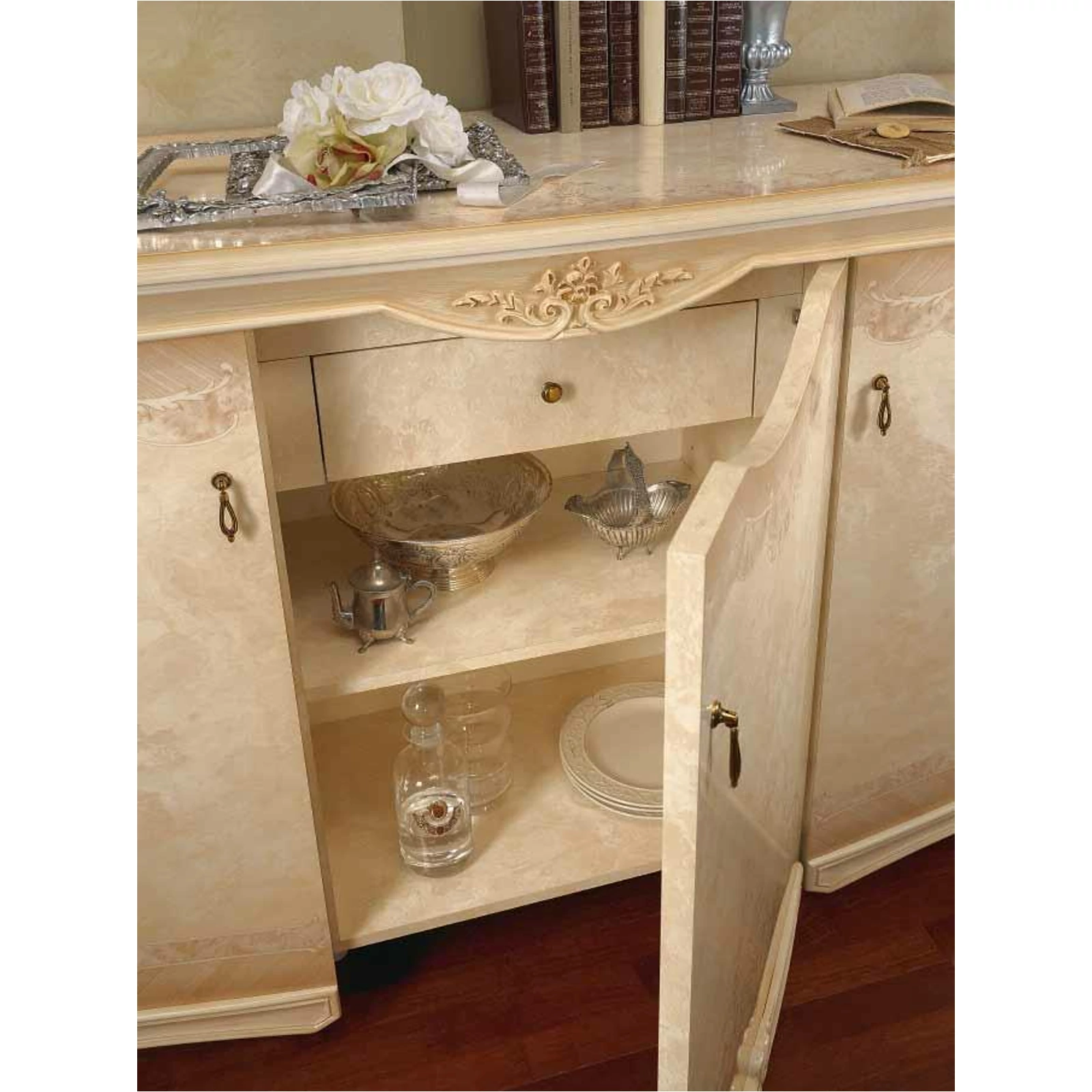 Particle board panel structure with decorative veneer, inlaid type decorations and polyester coating with semi-gloss finish. 30 mm thick sides, base and top 18 mm, drawers 25 mm. 25 mm MDF doors with engraved glass panes. 8 mm MDF back with upholstery. Wood effect top and cornices. Drawer sides in ply with dovetailed joints. Internal shelves in glass, 6 mm thick.