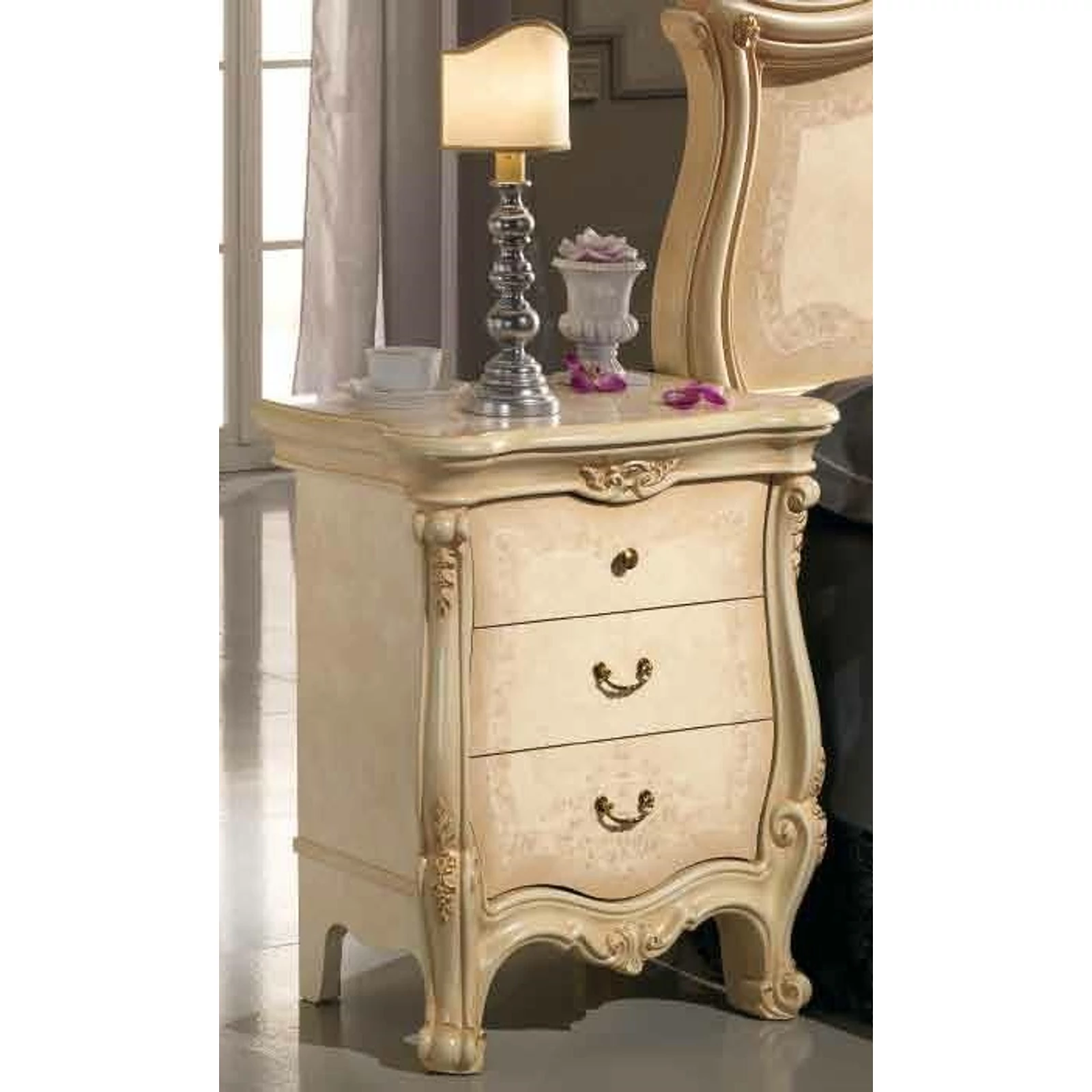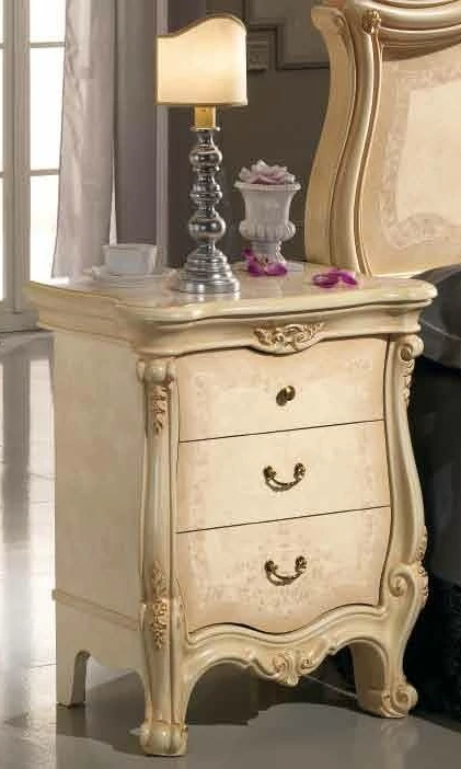 The upscale style of the classic bedroom set of this collection highlights the beige colored furniture and its golden details.