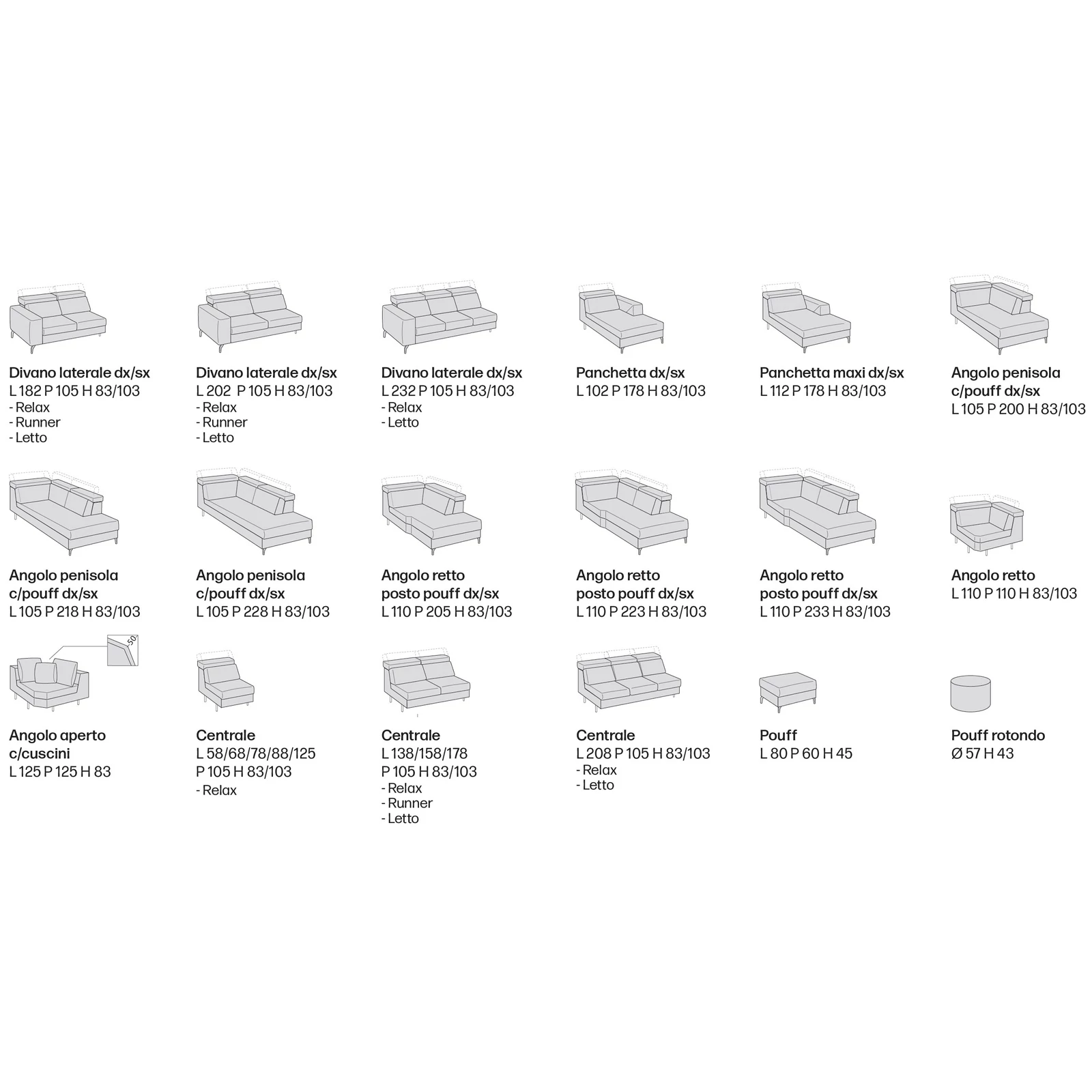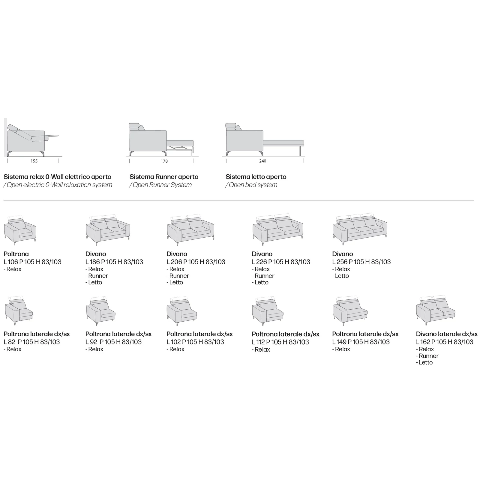 The Space Fly sofa is fully customizable: choose from multiple sizes and leg options, and from awide selection of fabrics and leathers; it can also be ordered as a sofa bed (letto), with sliding seats (runner), and as a complete living‑room set – so the most suitable piece is guaranteed! Optional features include power recline, armchair, ottoman, decorative cushions, lamp, wireless charger, plus tablet and smartphone holder. For details and exact prices, the team is happy to help via the listed contacts.