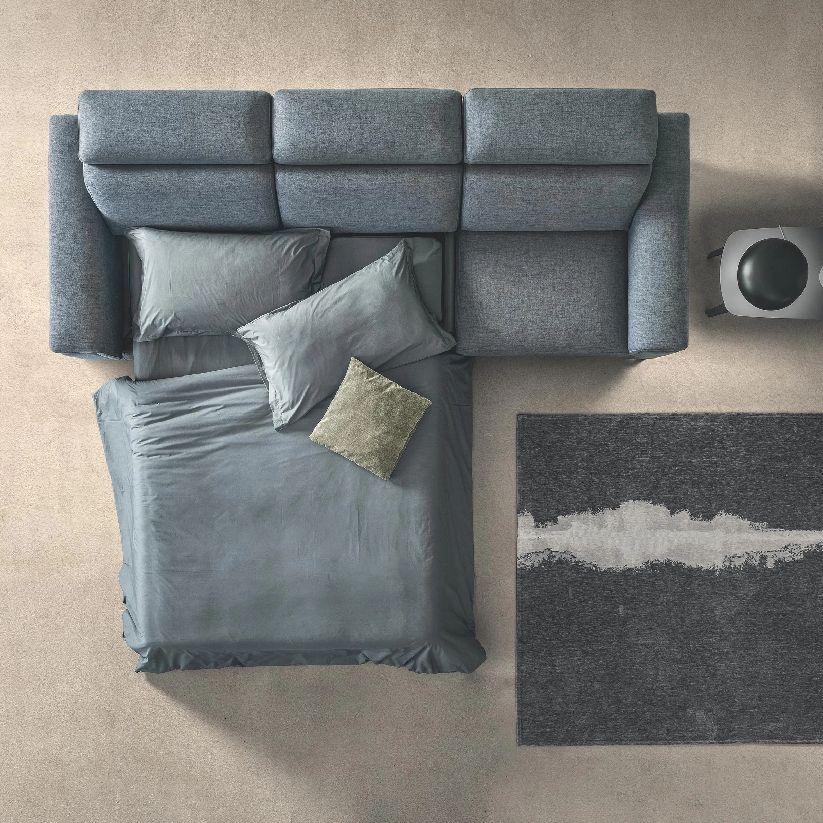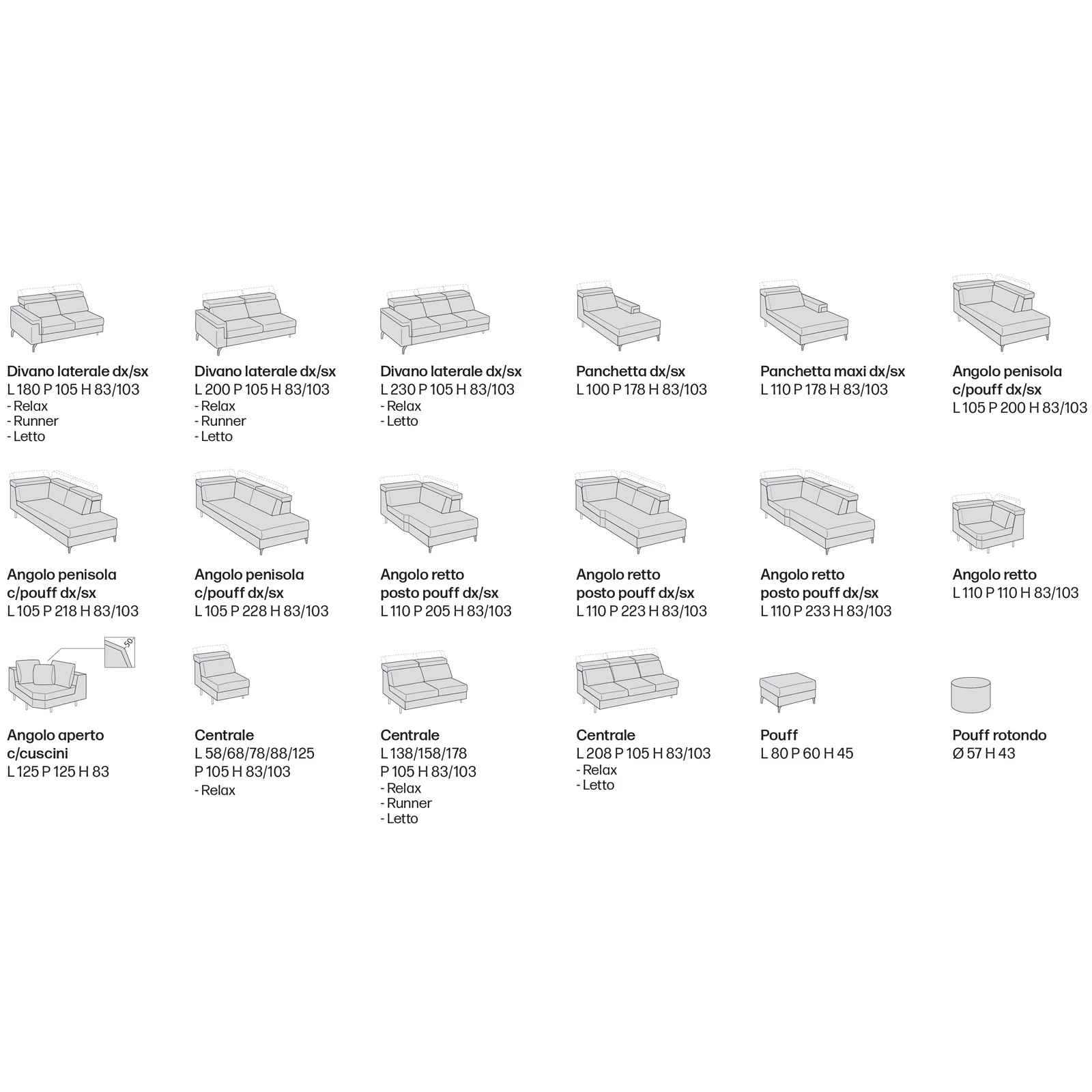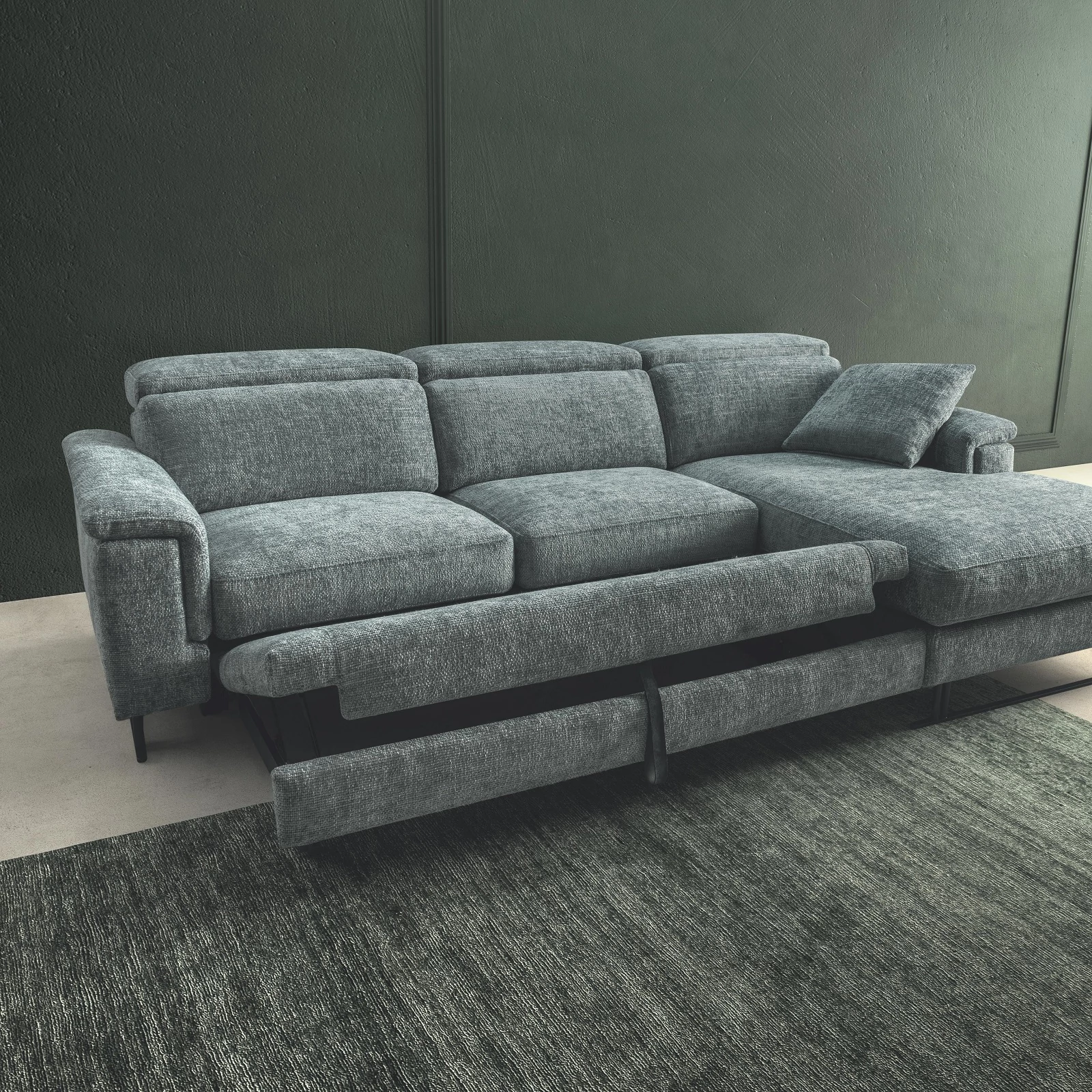 The Space Time sofa is fully customizable: choose from multiple sizes and leg options, and from awide selection of fabrics and leathers; it can also be ordered as a sofa bed (letto), with sliding seats (runner), and as a complete living‑room set – so the most suitable piece is guaranteed! Optional features include power recline, armchair, ottoman, and decorative cushions. For details and exact prices, the team is happy to help via the listed contacts.