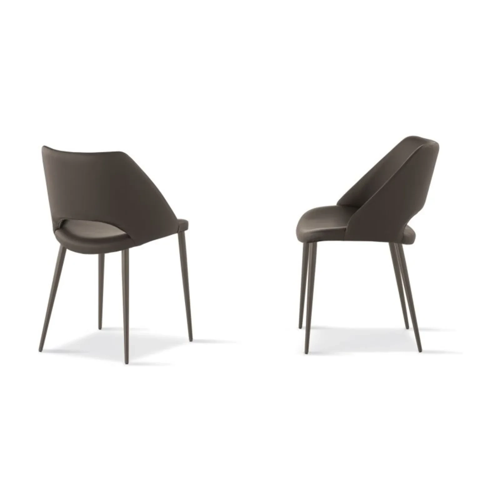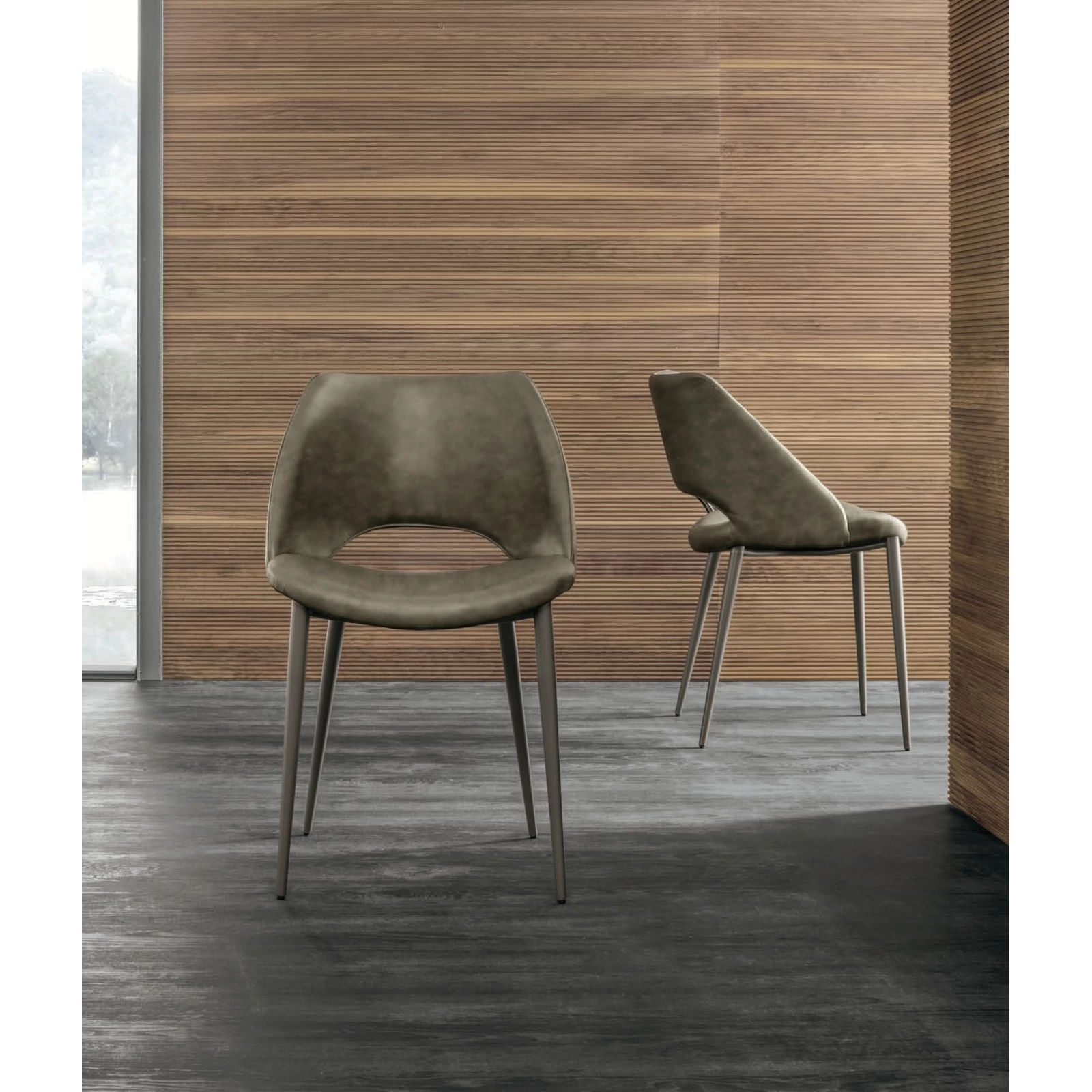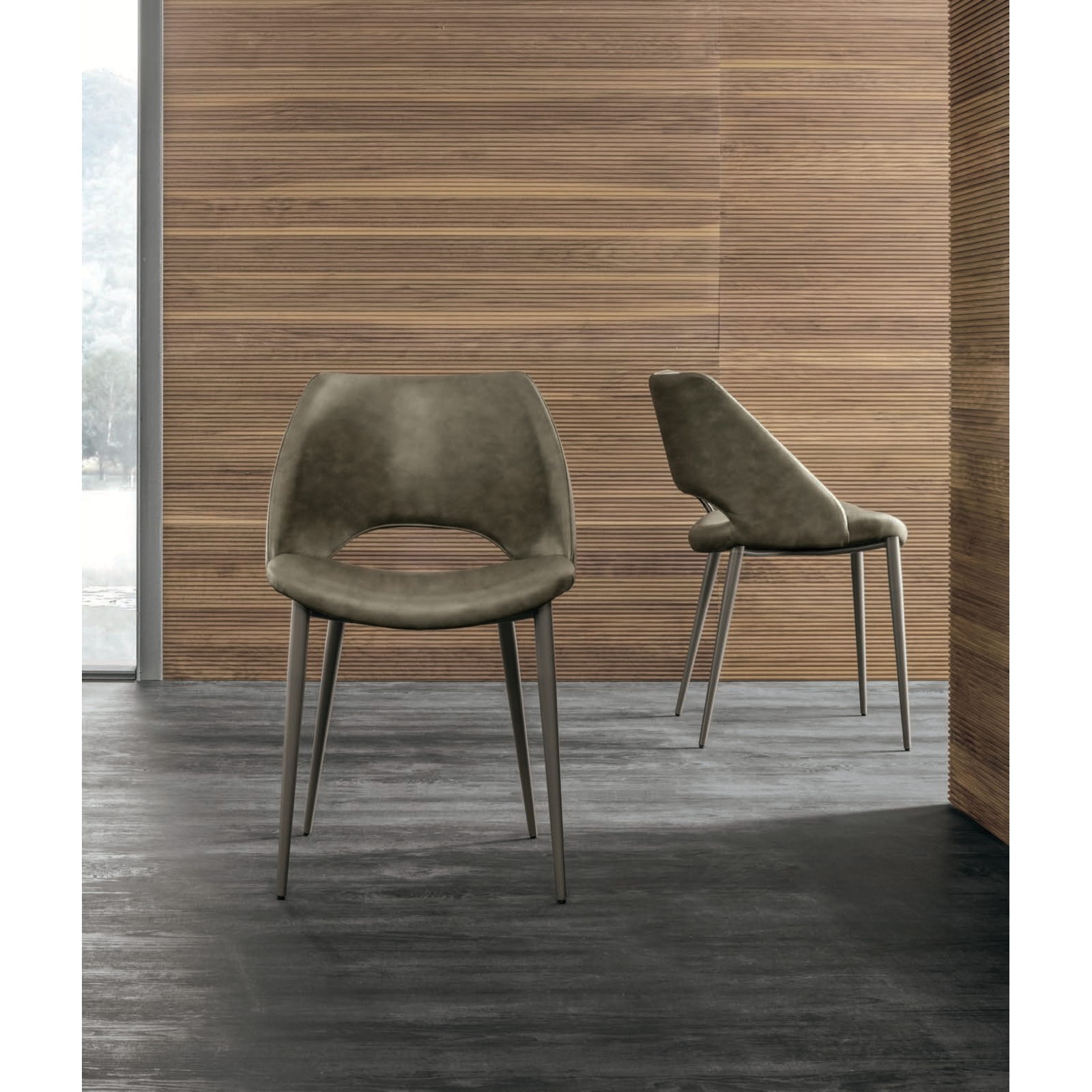 The Arisa chair features a bold, recognizable design born from the idea of modern, enveloping comfort. The distinctive cut of the back enhances the rear view, while the slightly outward-angled tapered legs emphasize the flared lines, creating a contemporary Italian upholstered chair with a wide fabric selection.