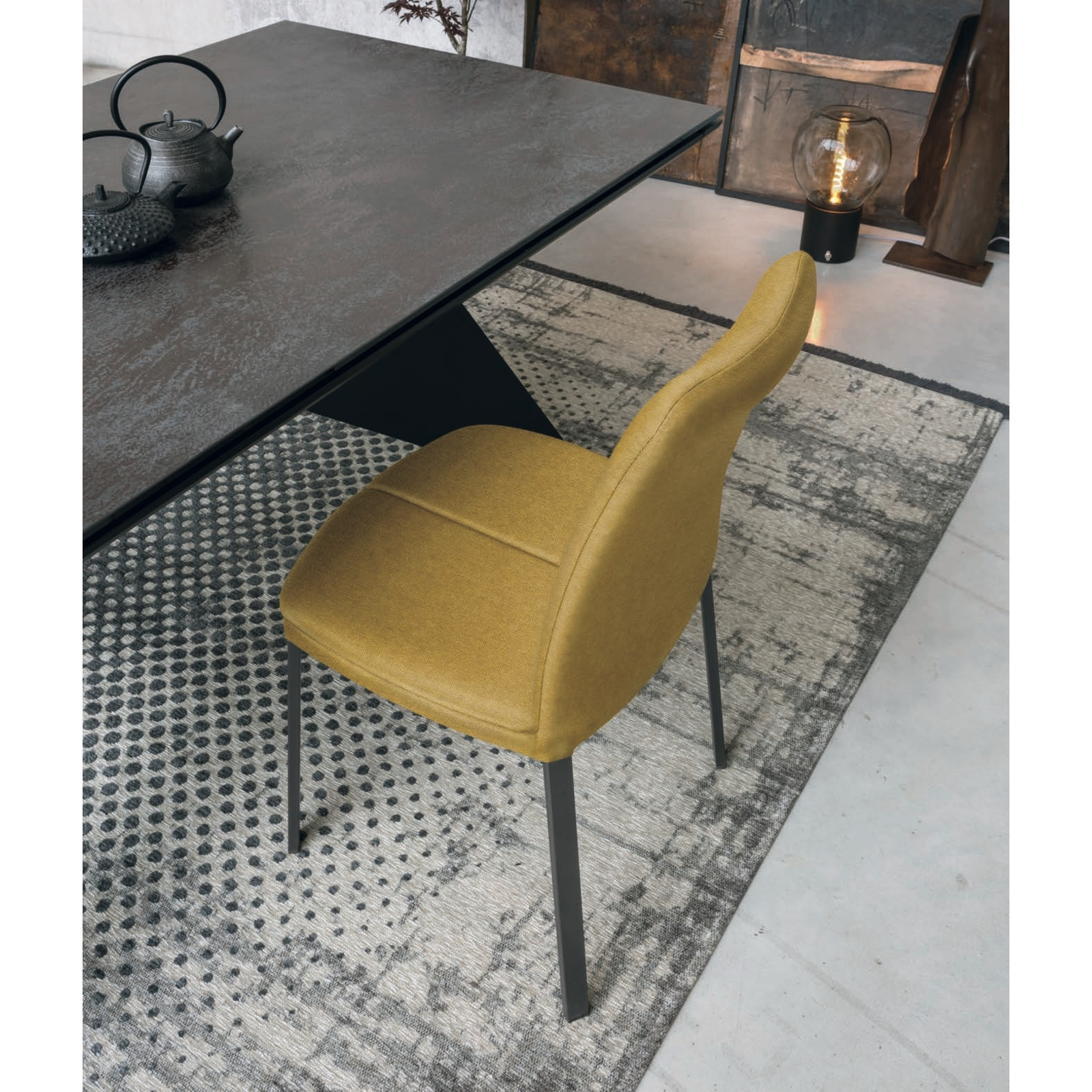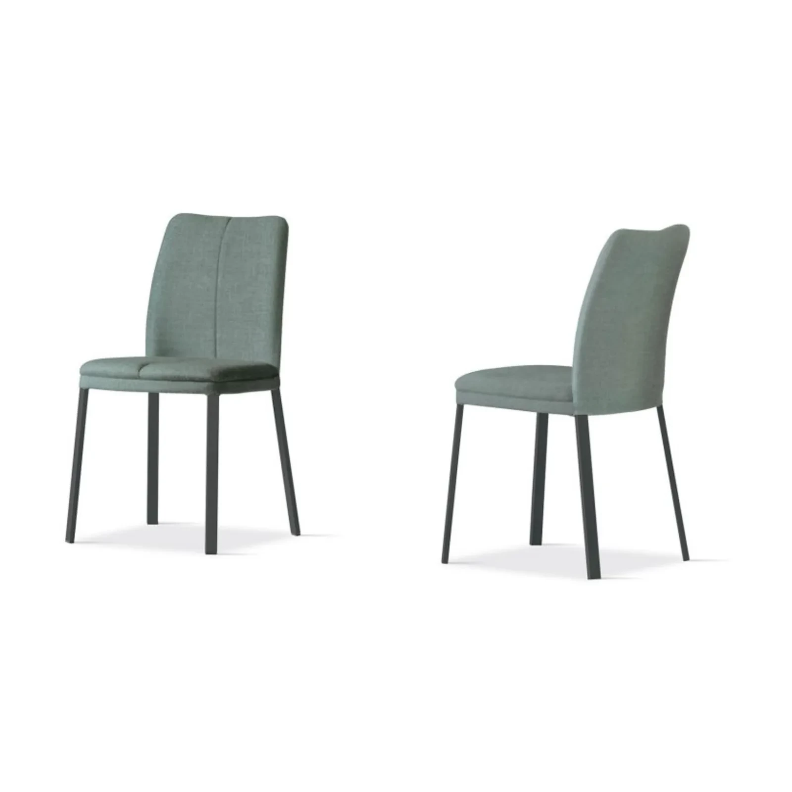 The Chicco chair is an elegant Italian upholstered chair for convivial spaces, featuring tubular metal legs, a padded seat and a curved backrest. Its distinctive central stitching evokes a coffee bean, while a wide fabric selection ensures modern style and quality across diverse interiors.
