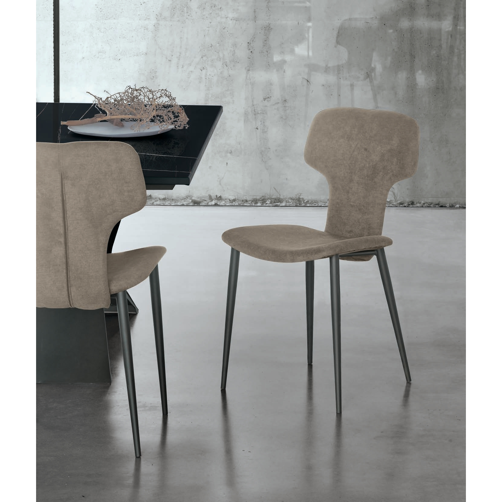 The Dora chair is a light and elegant upholstered chair designed for home interiors. Its classic yet distinctive silhouette is defined by the rounded seat, the uniquely shaped backrest, and the slender metal legs. A wide selection of fabrics ensures versatile use. A modern Italian chair crafted from quality materials.