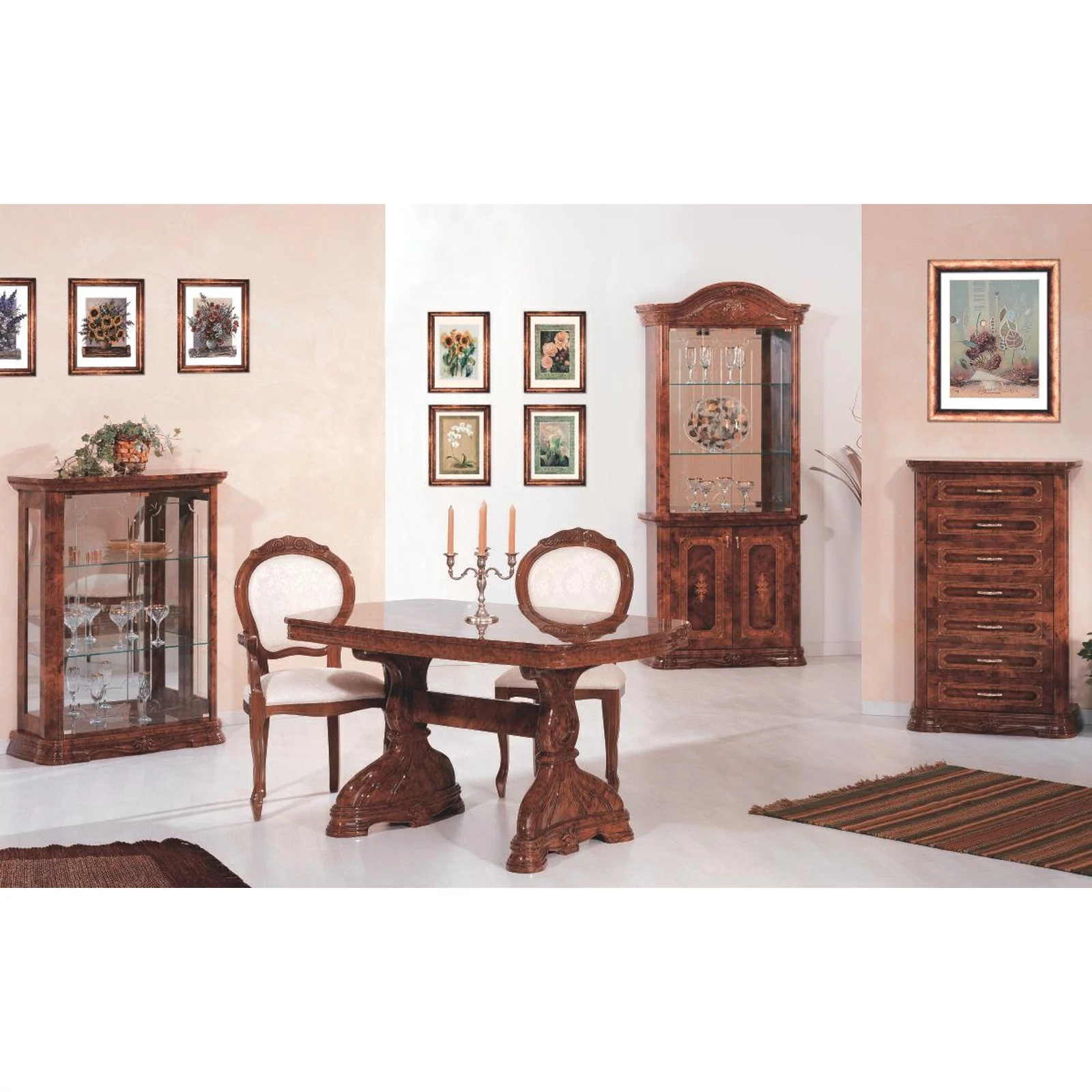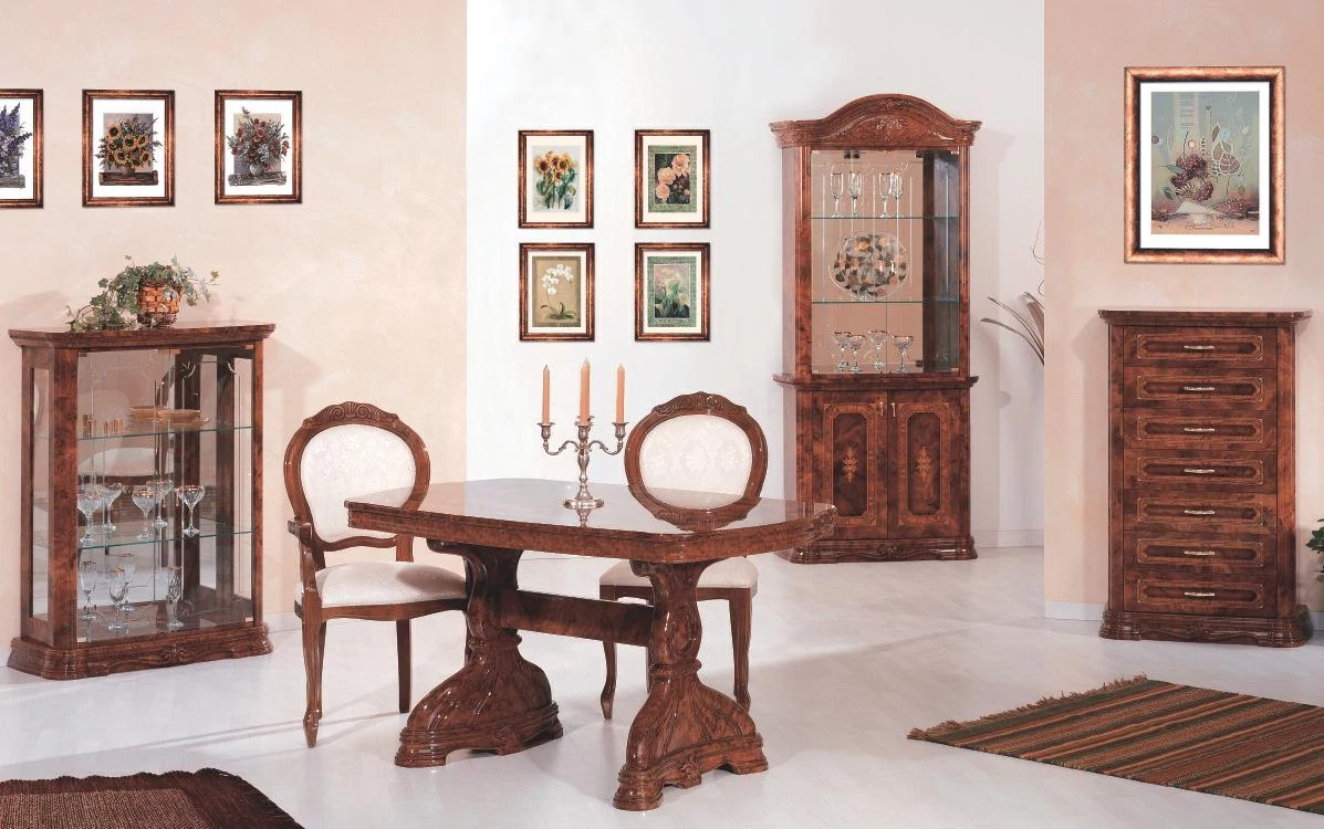 In this Italian style living room there are a lot of different shapes and decorations. All of its components, from the table through the easy chairs and cabinets to the chest of drawers, create the feeling of magic, charm and great traditions.