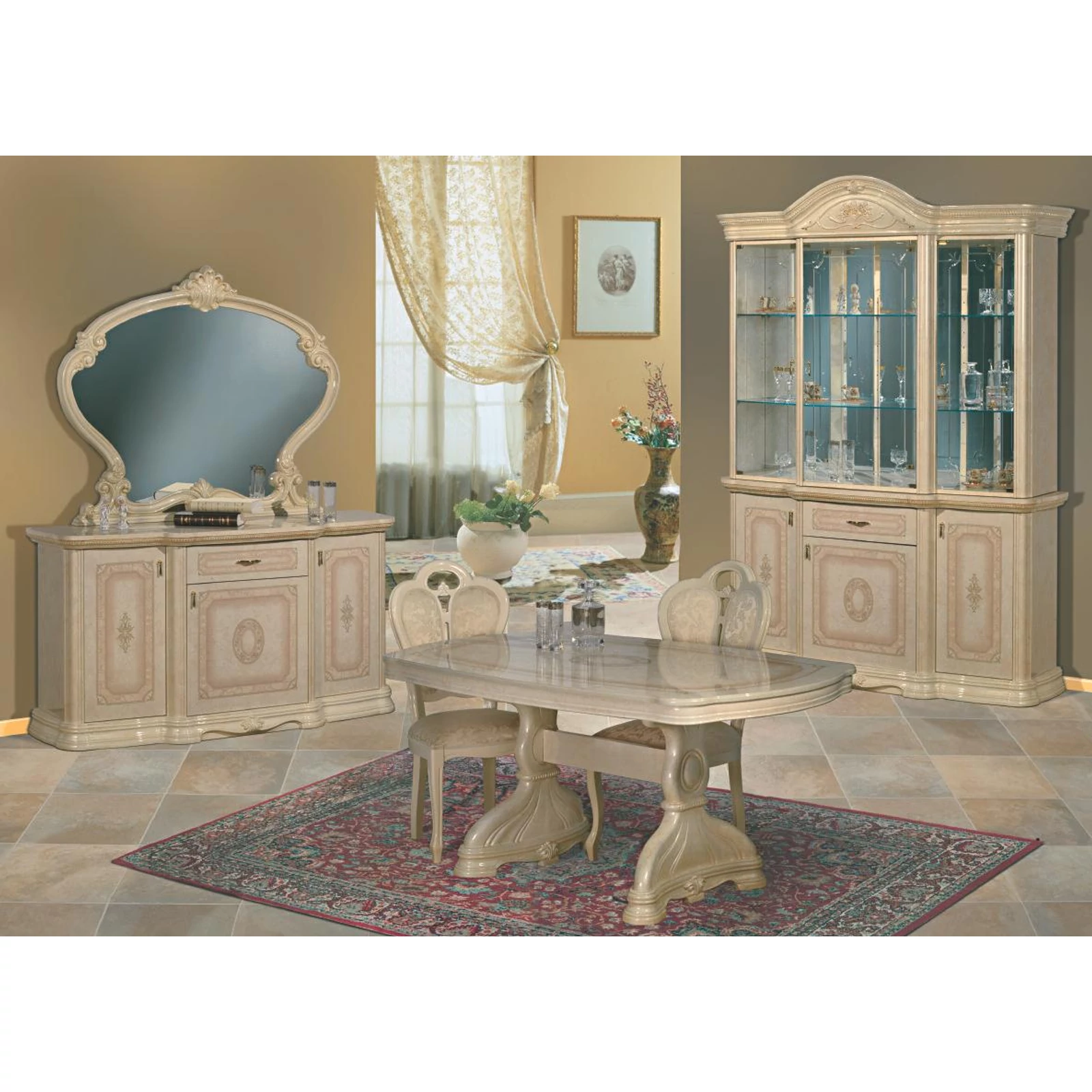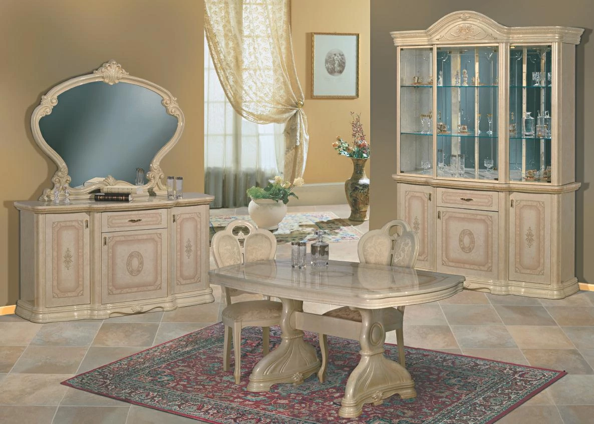 The table is supported by two huge legs, which reminds us to a shell. The cabinet and the chest of drawers are of the same structure, with a drawer in the middle and with three doors, and the mirror is huge. That is how a real Italian living room looks like.