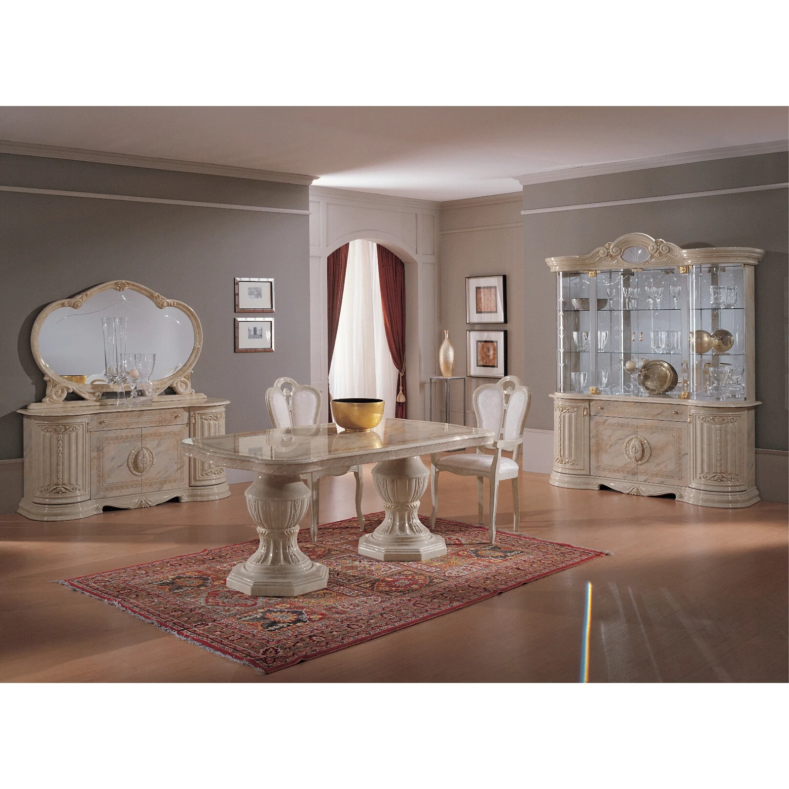 BC-BED-VT4-014-glass doors sideboard - beigeBC-BED-BF4-014-doors buffet chest of drawers with 1 drawer - beigeBC-BED-SPE-01Wide mirror - beigeBC-BED-TAV-01Dining table 185x105 cm (+45 cm extendable) - beigeBC-BED-SED-01Giglio Chair - beigeBC-BED-CAP-01Giglio Easy chair - beige