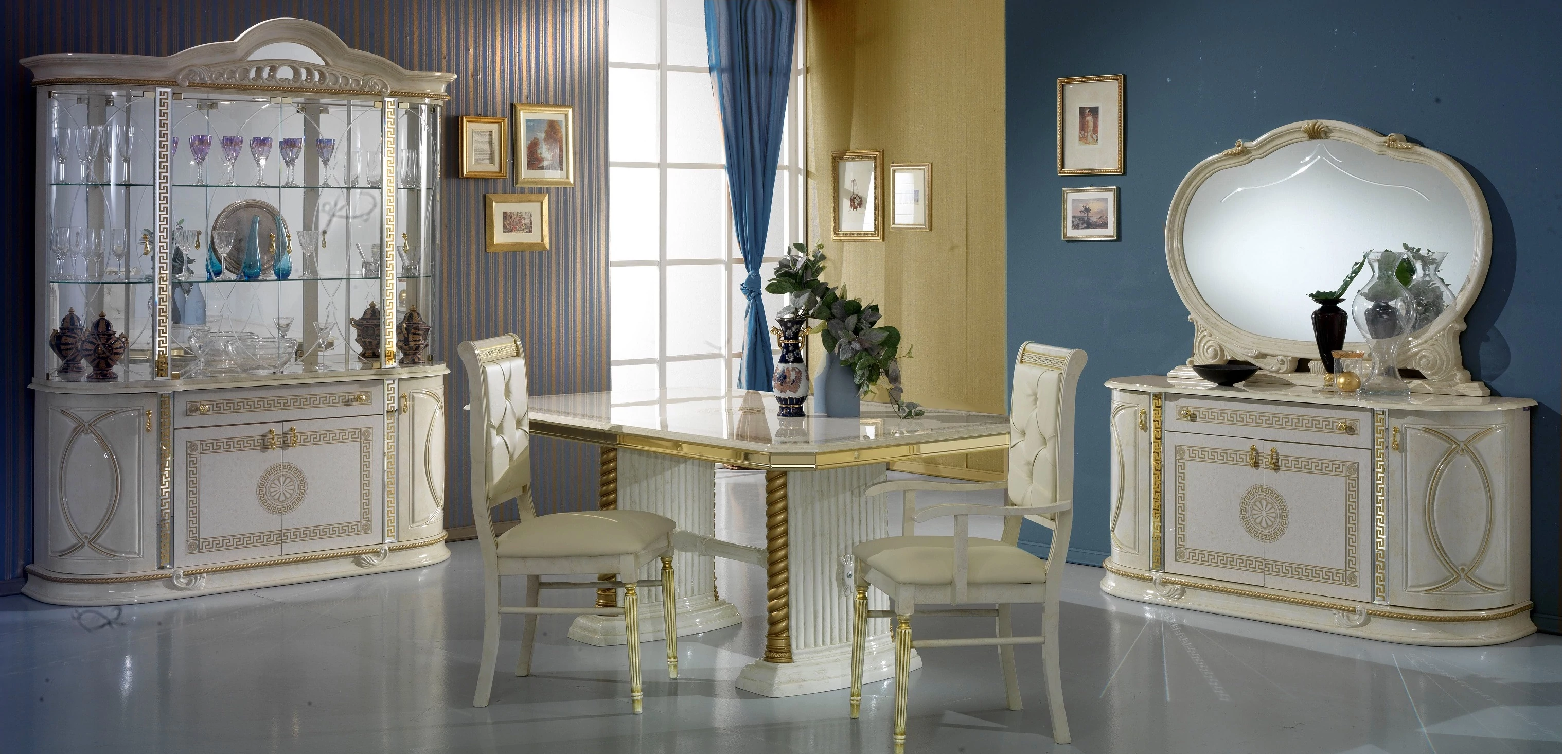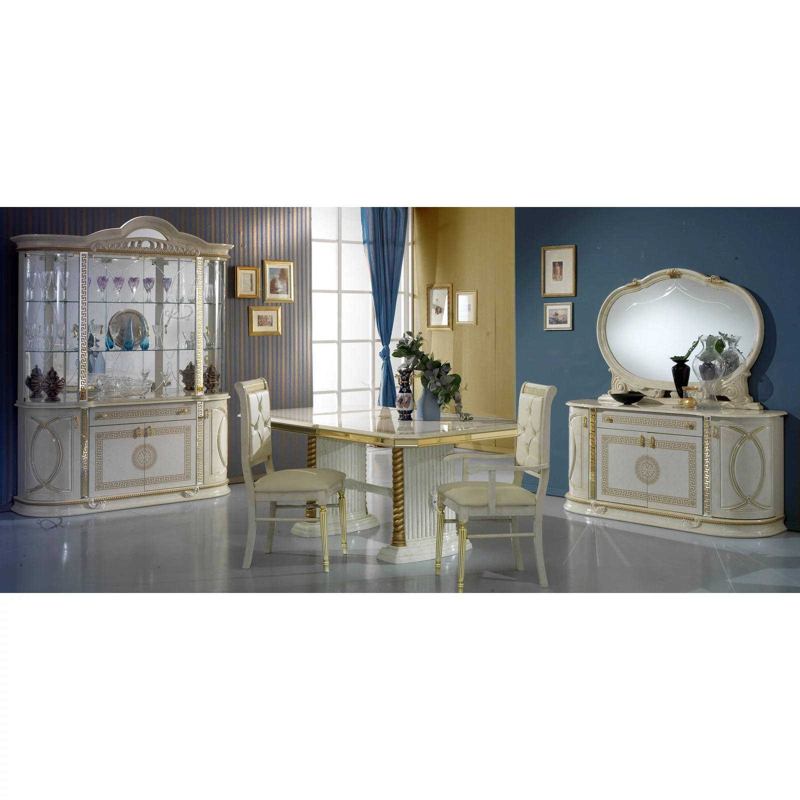 BC-VED-VT4-014-glass doors sideboard - beigeBC-VED-BF4-014-doors buffet chest of drawers with 1 drawer - beigeBC-VED-SPE-01Wide mirror - beigeBC-VED-TAV-01Dining table 185x105 cm (+45 cm extendable) - beigeBC-VED-SED-04New Chair - beigeBC-VED-CAP-04New Easy chair - beige