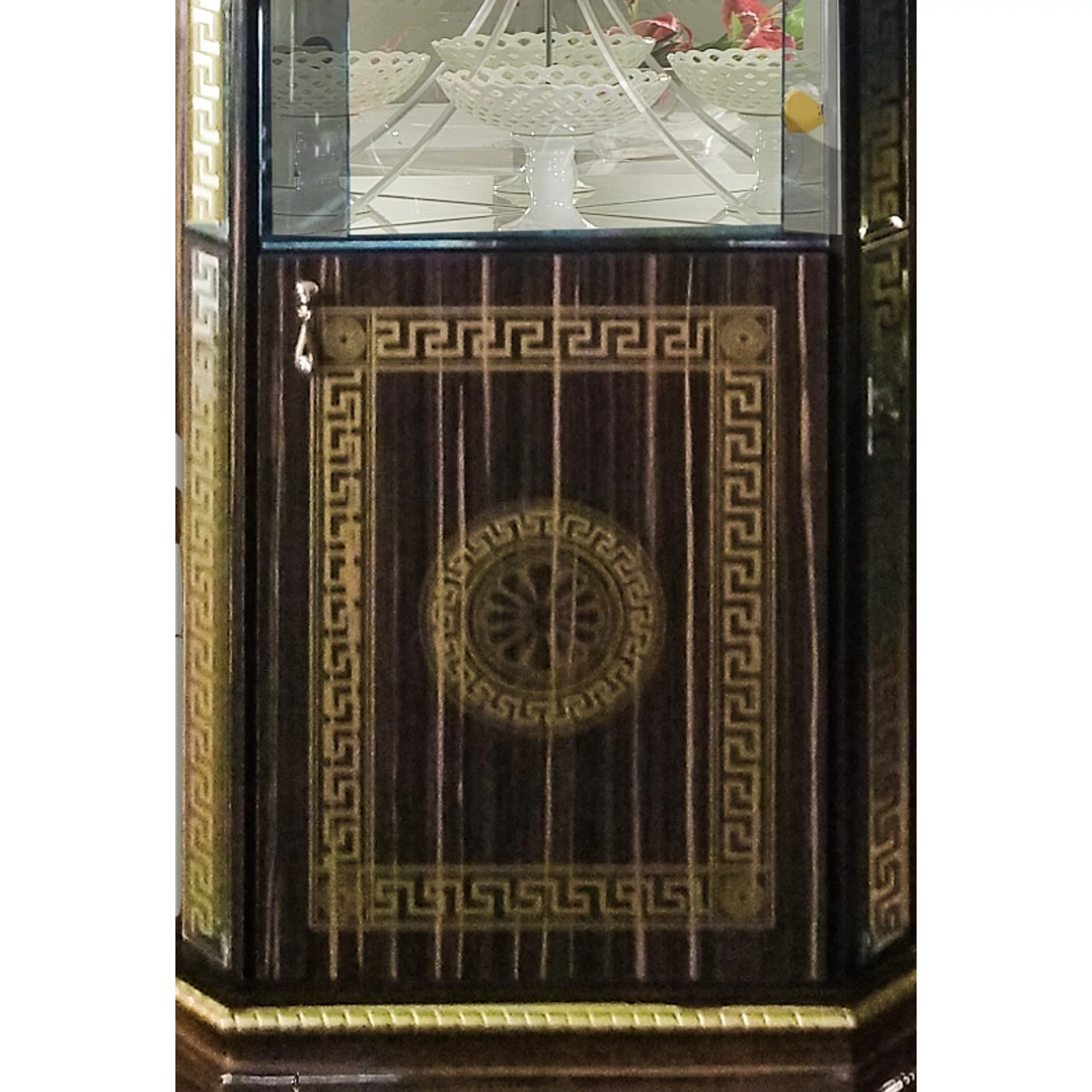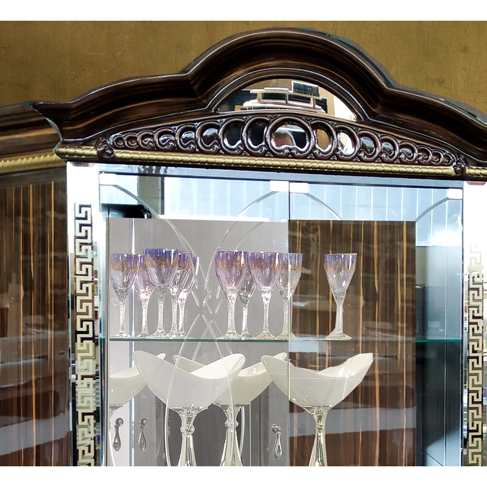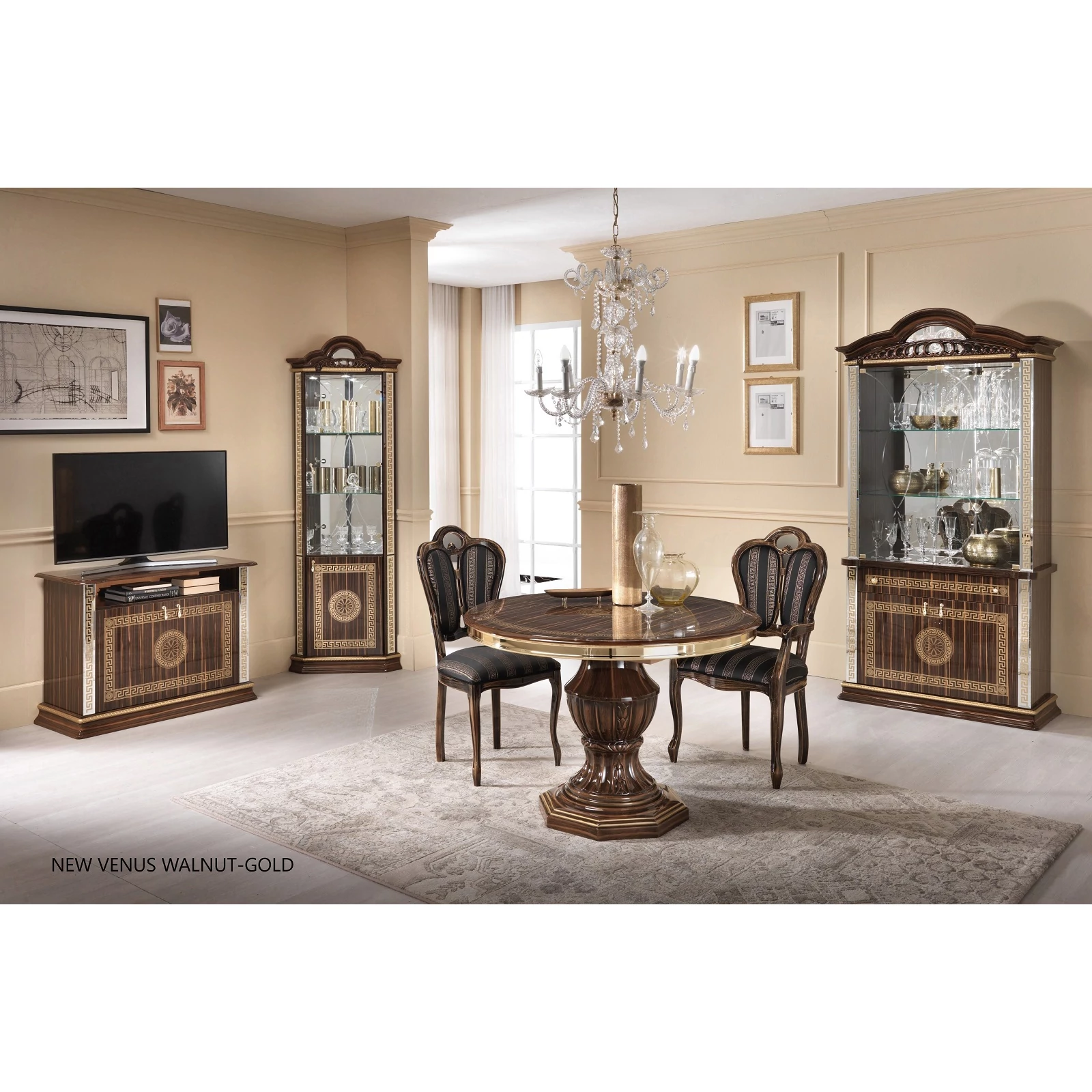 BC-VED-VT2-042-glass doors sideboard - walnutBC-VED-ANG-04Corner display cabinet - walnutBC-VED-PTV-08TV commode - walnutBC-VED-TAV-14Round dining table 110x110 cm (+40 cm extendable) - walnutBC-VED-SED-07Giglio Chair - walnutBC-VED-CAP-07Giglio Easy chair - walnut
