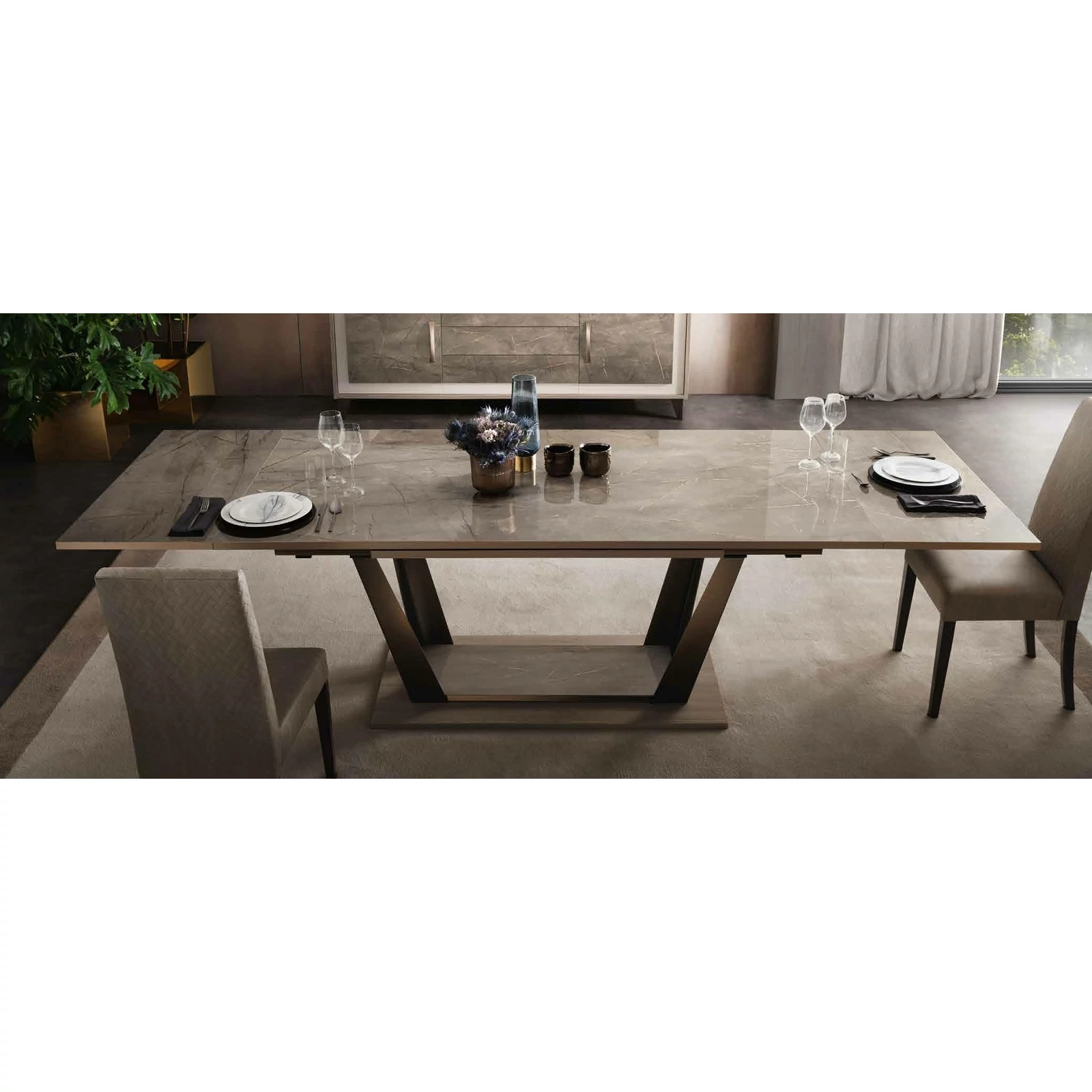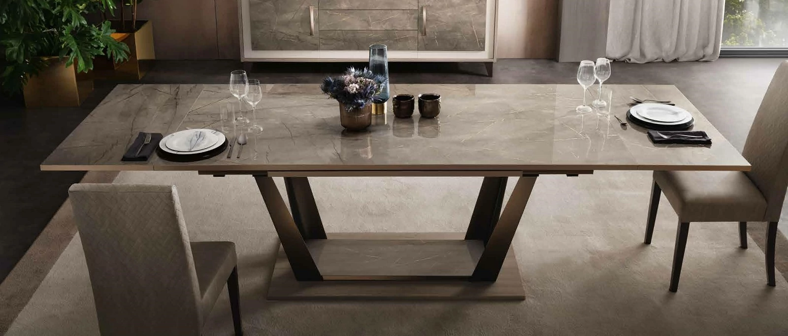 Ambra is the new Collection of the brand Adora, that includes furnishing elements for your living room, dining room and bedroom. Once again, Adora has left its unmistakable hallmark on furniture items that fly the flag for the prestige of Italian style and for the Italian flair for furniture with elegance and an inimitable contemporary flavour. The contrasting textures and the dissimilar volume effects between the different surfaces are sophisticated details that do not remain unnoticed and give character to each single furniture element. The structure of the furniture items in elm-wood finish forms an elegant contrast with the textured, open-pored doors, which are overlaid with marble-finish panels. Furnishing solutions with stylish, elegant silhouettes repeat the same contrasting effect that is enhanced by the satin-finish bronze profiles of the handles and feet. Another feature worth noting is the balance of delicate shades that add their own touch of elegance to each piece, with bright reflections from mirrored glass that, like a jewel, give luminosity to the whole furniture composition.
