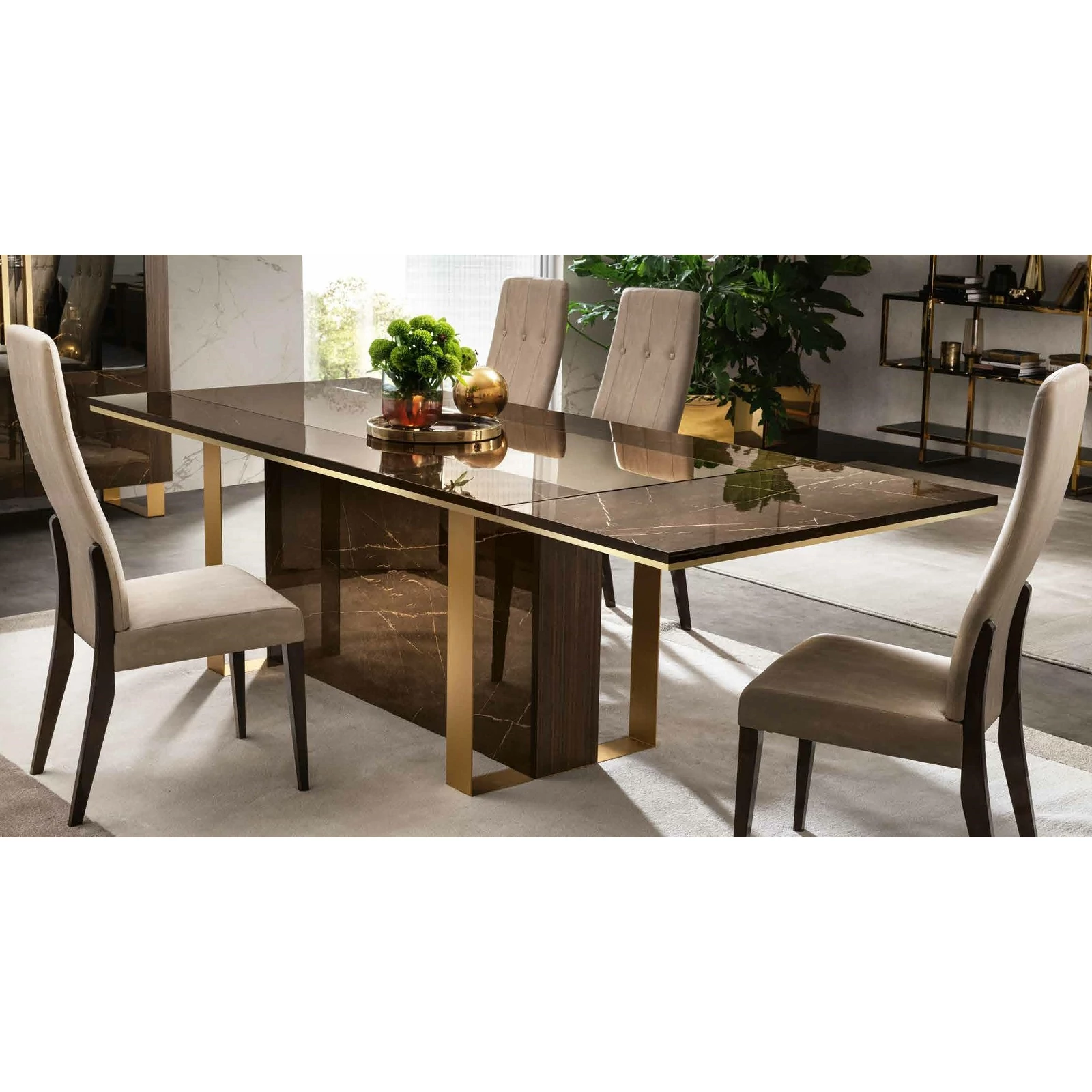 Essenza is the new Collection of the brand Adora, that includes furnishing elements for your living room, dining room and bedroom. This collection embodies contemporary elegance in small details that define the research for aesthetics, accomplished to create every piece of furniture. The concept is inspired by the classic / contemporary dualism, and by the contrasting textures of two precious finishes, embellished by elegant golden details. The contrast between the dark hues of wenge wood and the shining marble finish, with its typical bronze veins, is the leitmotiv behind this collection. The complete collection is enhanced by the satin-finish golden elements used for the metal handles of the nightstands, the frames of the display cabinets, dining room tables and living area furniture.