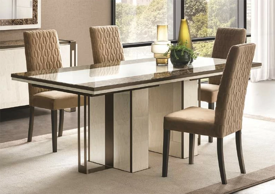 Poesia bears the signature of the Adora brand and is composed of complements designed to furnish the living room, dining room and bedroom. A refined collection in which every piece of furniture is a metaphor for Made-in-Italy beauty and elegance. Minimalist details meet sophisticated materials in a fusion of refined character. With Poesia, contemporary style acquires a new image, thanks to its attractive geometries, special finishes and contrasting materials. Emperador Dark effect screen-printed glass tops, doors in glossy beige marble finish with slight color variations, and metal handles in warm bronze shades are precious details that enrich each element and constitute the leitmotif of the entire collection. The square shapes of the furniture and seats appear linear and graceful, providing a play of volumes and softness that integrate comfort, aesthetics and functionality. Linearity, essentiality and a touch of boldness are Poesia’s stylistic hallmarks. This is where the true poetry of this collection lies: in its ability to convey the value of Italian furniture, by creating cozy and comfortable furnishing scenarios.