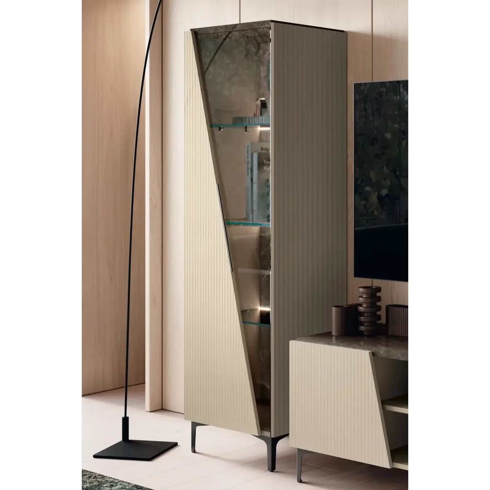 CA Fidia Day Modern Beige-Marble Display Cabinet with LED Light, 1-Door
