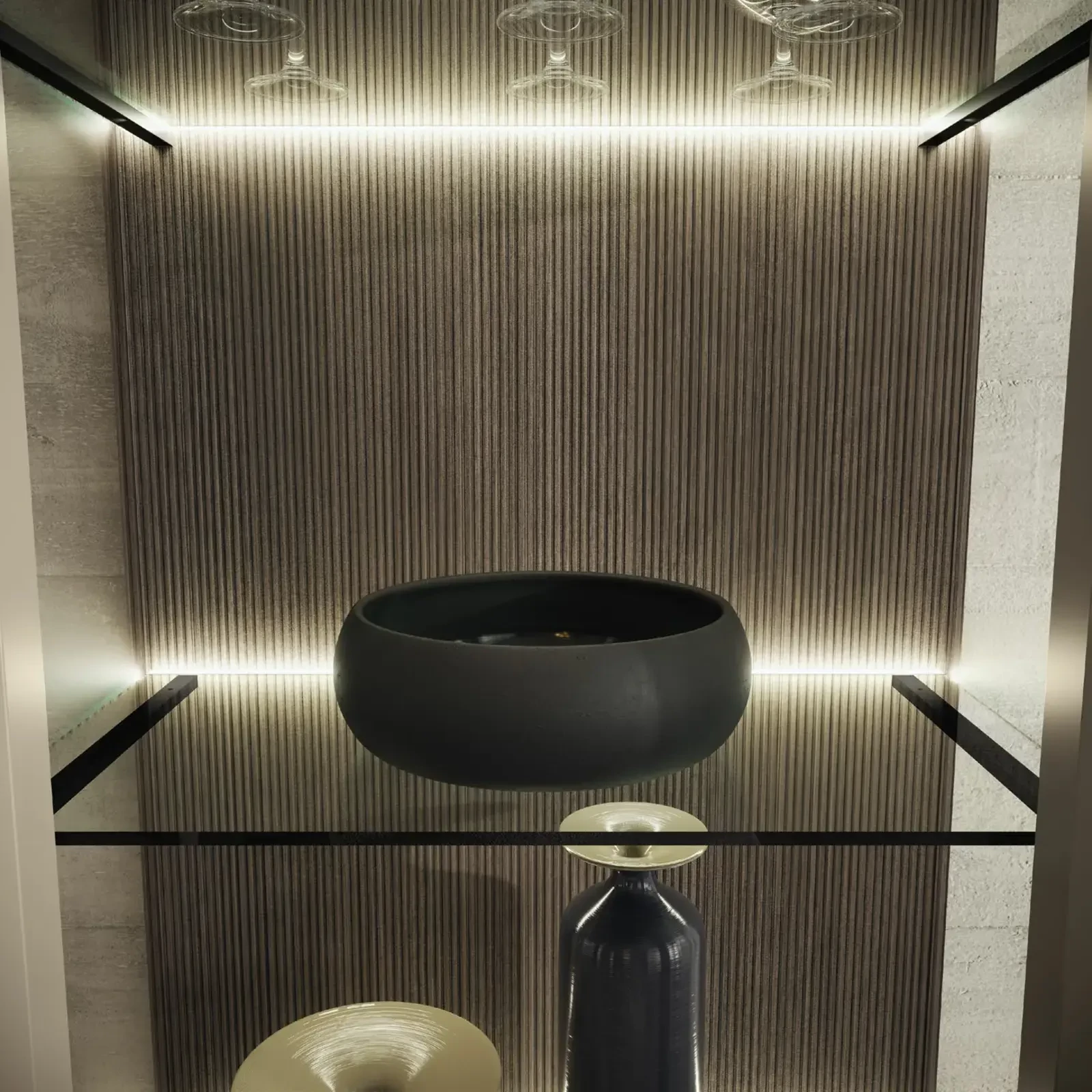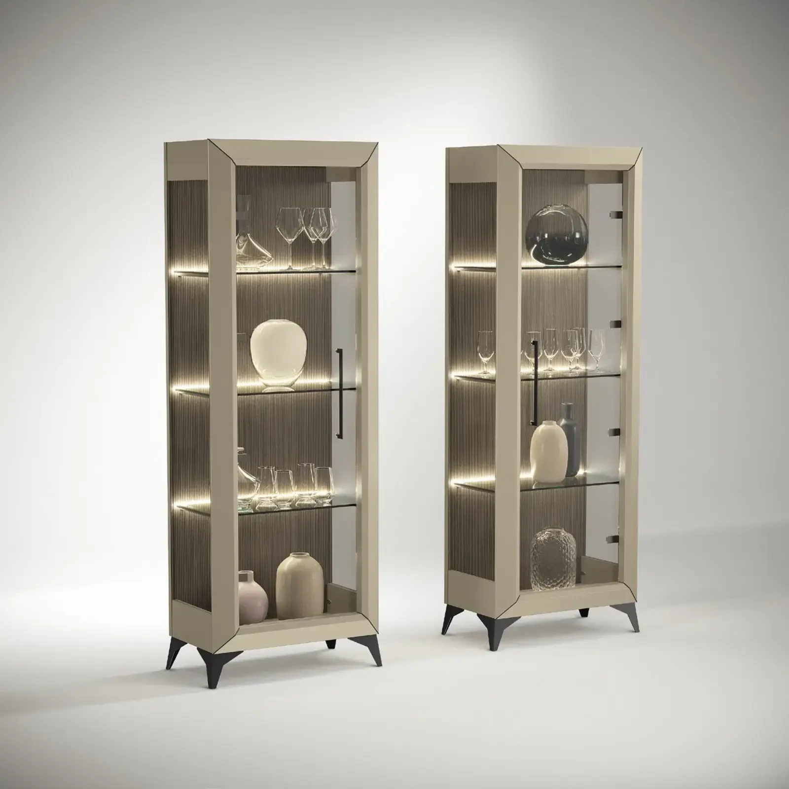 Modern Italian display cabinet with warm LED lighting, glass shelves, available in 1- and 2-door versions.