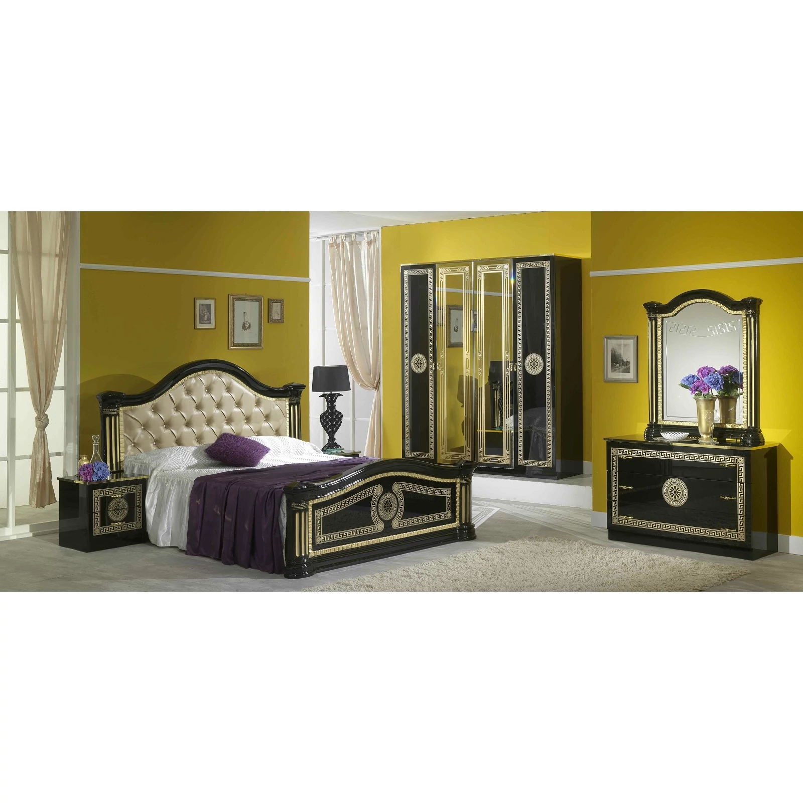 BC-SER-LET-16C-NODouble bedstead with capitonné padded headboard - 160 cm, black-goldBC-SER-CMN-NONight table - black-goldBC-SER-CMD-NOChest of drawers - black-goldBC-SER-SPE-NODecorated mirror - black-goldBC-SER-AR4-NO4-doors cabinet, with 2 mirrored doors - black-gold