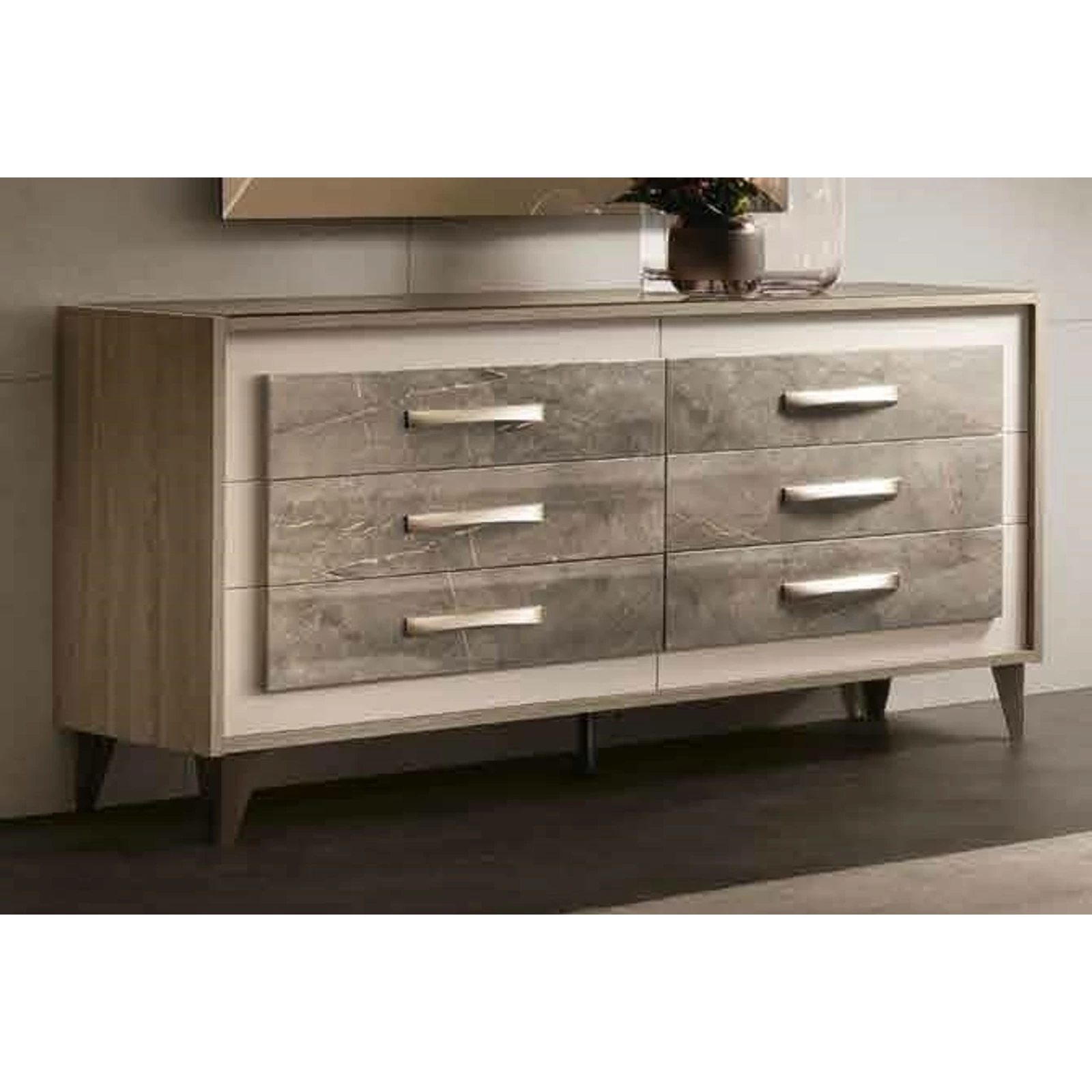 Ambra is the new Collection of the brand Adora, that includes furnishing elements for your living room, dining room and bedroom. Once again, Adora has left its unmistakable hallmark on furniture items that fly the flag for the prestige of Italian style and for the Italian flair for furniture with elegance and an inimitable contemporary flavour. The contrasting textures and the dissimilar volume effects between the different surfaces are sophisticated details that do not remain unnoticed and give character to each single furniture element. The structure of the furniture items in elm-wood finish forms an elegant contrast with the textured, open-pored doors, which are overlaid with marble-finish panels. Furnishing solutions with stylish, elegant silhouettes repeat the same contrasting effect that is enhanced by the satin-finish bronze profiles of the handles and feet. Another feature worth noting is the balance of delicate shades that add their own touch of elegance to each piece, with bright reflections from mirrored glass that, like a jewel, give luminosity to the whole furniture composition.