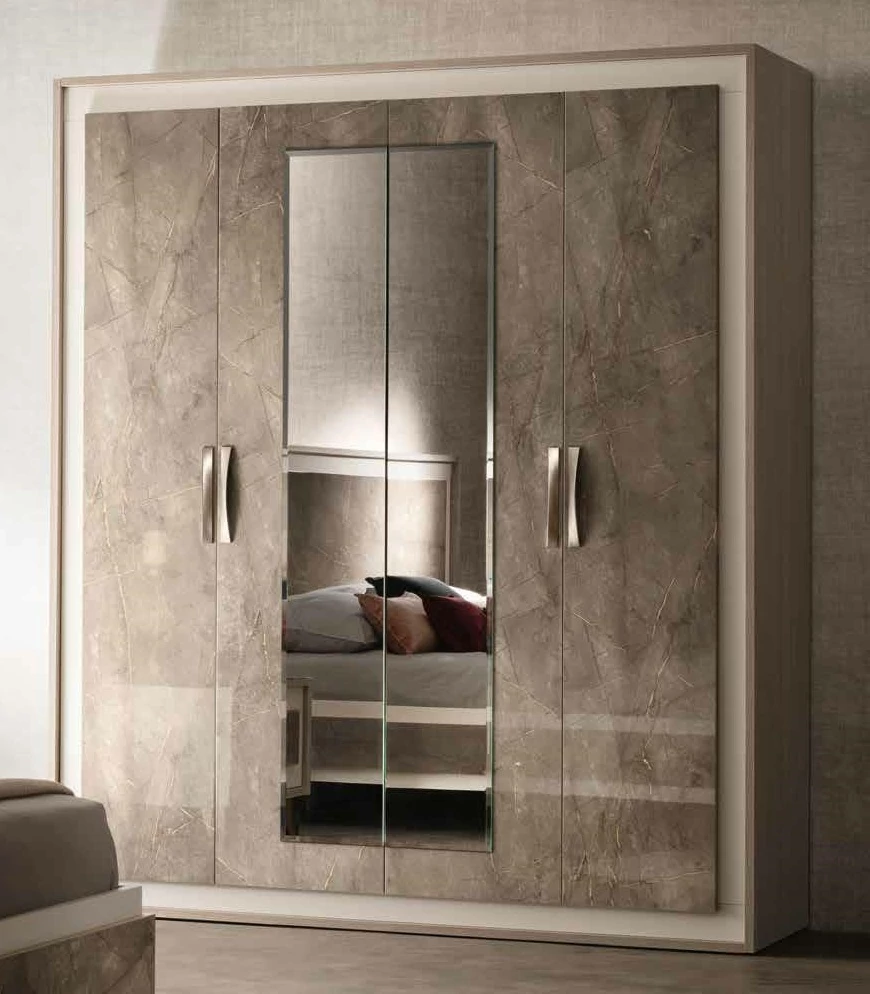 Ambra is the new Collection of the brand Adora, that includes furnishing elements for your living room, dining room and bedroom. Once again, Adora has left its unmistakable hallmark on furniture items that fly the flag for the prestige of Italian style and for the Italian flair for furniture with elegance and an inimitable contemporary flavour. The contrasting textures and the dissimilar volume effects between the different surfaces are sophisticated details that do not remain unnoticed and give character to each single furniture element. The structure of the furniture items in elm-wood finish forms an elegant contrast with the textured, open-pored doors, which are overlaid with marble-finish panels. Furnishing solutions with stylish, elegant silhouettes repeat the same contrasting effect that is enhanced by the satin-finish bronze profiles of the handles and feet. Another feature worth noting is the balance of delicate shades that add their own touch of elegance to each piece, with bright reflections from mirrored glass that, like a jewel, give luminosity to the whole furniture composition.