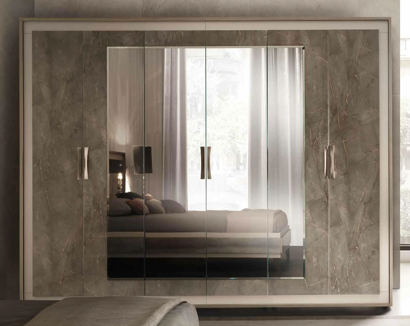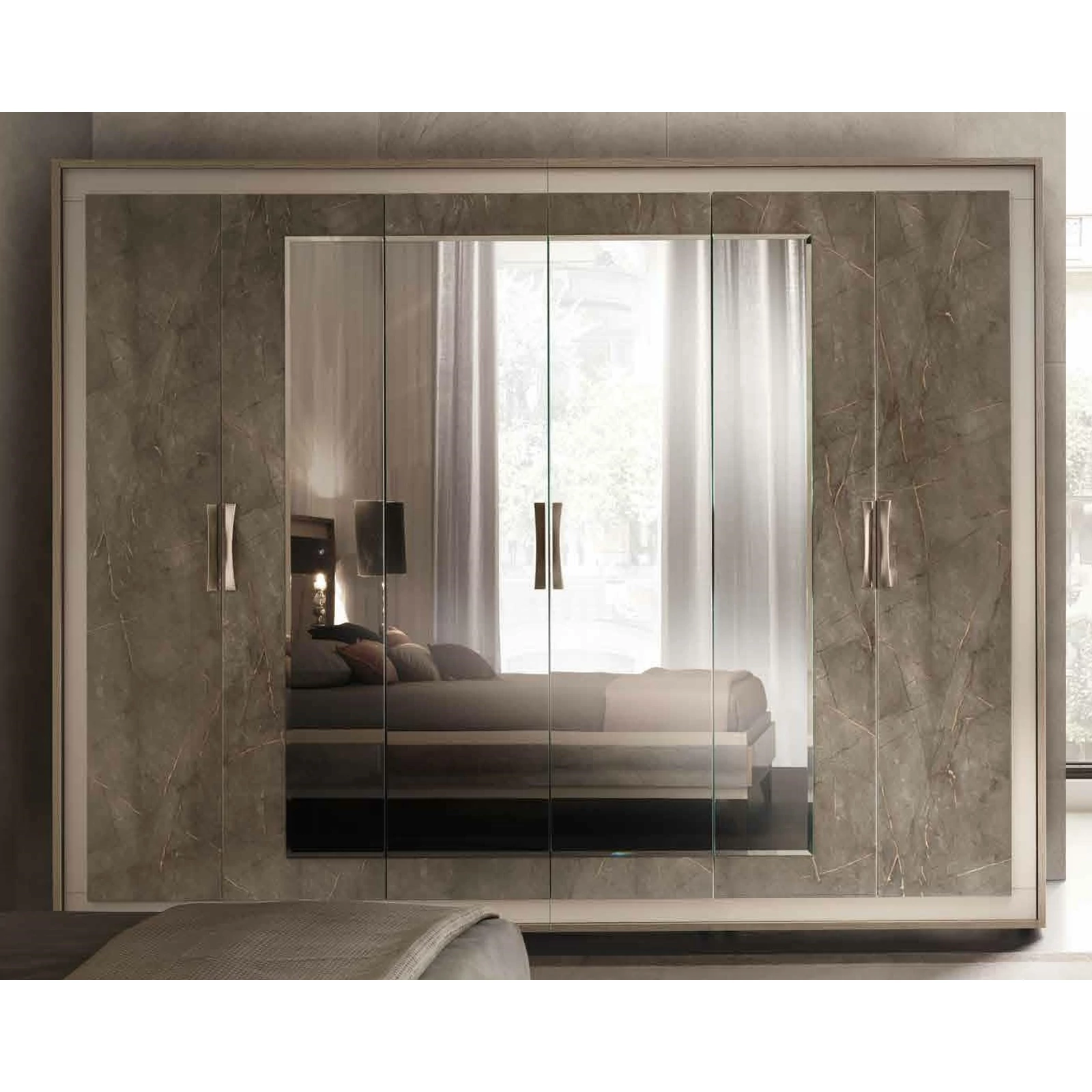 Ambra is the new Collection of the brand Adora, that includes furnishing elements for your living room, dining room and bedroom. Once again, Adora has left its unmistakable hallmark on furniture items that fly the flag for the prestige of Italian style and for the Italian flair for furniture with elegance and an inimitable contemporary flavour. The contrasting textures and the dissimilar volume effects between the different surfaces are sophisticated details that do not remain unnoticed and give character to each single furniture element. The structure of the furniture items in elm-wood finish forms an elegant contrast with the textured, open-pored doors, which are overlaid with marble-finish panels. Furnishing solutions with stylish, elegant silhouettes repeat the same contrasting effect that is enhanced by the satin-finish bronze profiles of the handles and feet. Another feature worth noting is the balance of delicate shades that add their own touch of elegance to each piece, with bright reflections from mirrored glass that, like a jewel, give luminosity to the whole furniture composition.