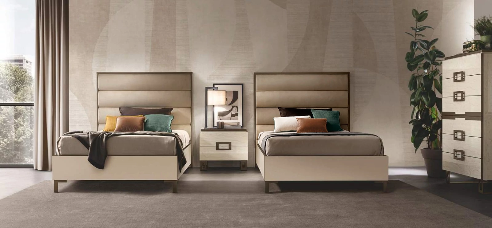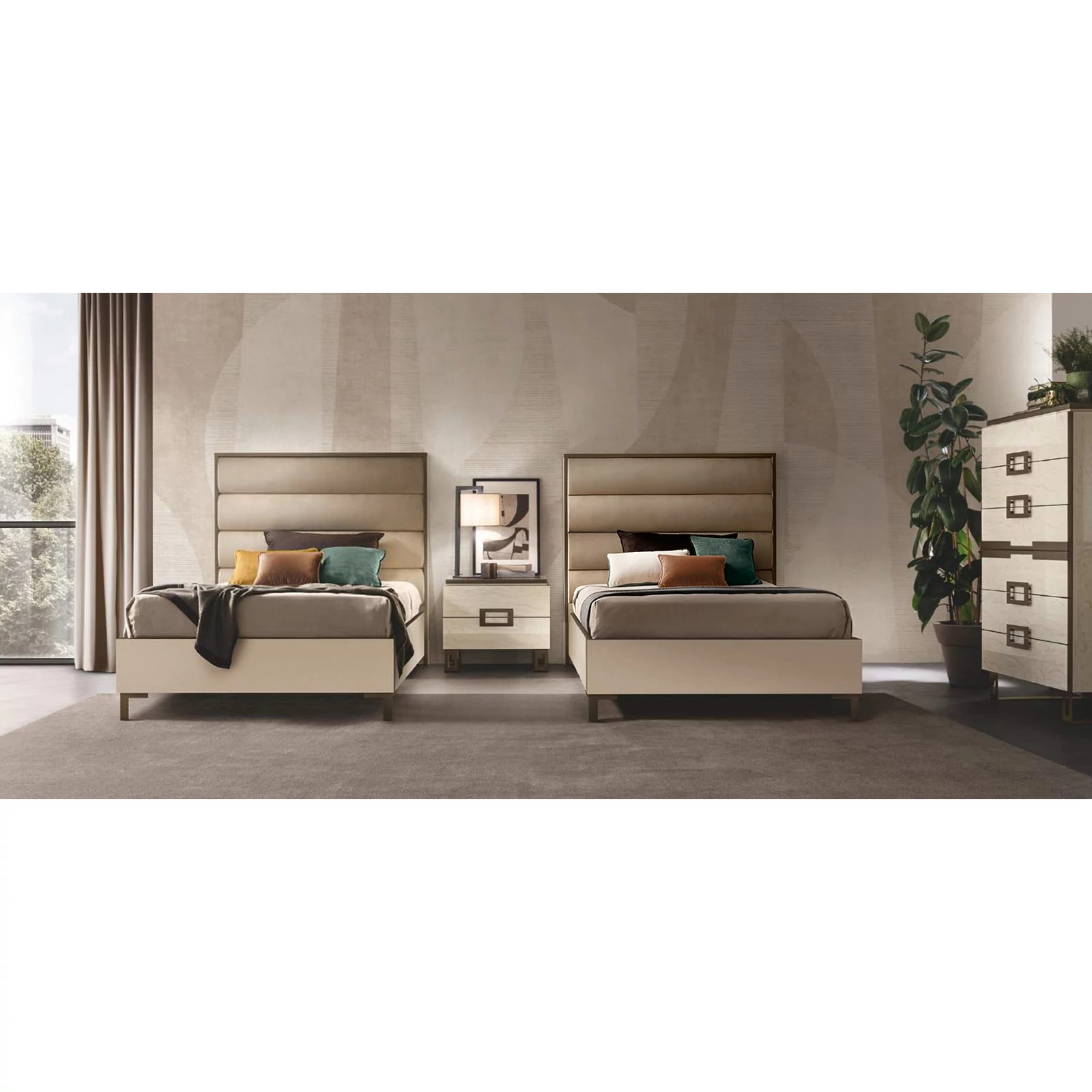Poesia bears the signature of the Adora brand and is composed of complements designed to furnish the living room, dining room and bedroom. A refined collection in which every piece of furniture is a metaphor for Made-in-Italy beauty and elegance. Minimalist details meet sophisticated materials in a fusion of refined character. With Poesia, contemporary style acquires a new image, thanks to its attractive geometries, special finishes and contrasting materials. Emperador Dark effect screen-printed glass tops, doors in glossy beige marble finish with slight color variations, and metal handles in warm bronze shades are precious details that enrich each element and constitute the leitmotif of the entire collection. The square shapes of the furniture and seats appear linear and graceful, providing a play of volumes and softness that integrate comfort, aesthetics and functionality. Linearity, essentiality and a touch of boldness are Poesia’s stylistic hallmarks. This is where the true poetry of this collection lies: in its ability to convey the value of Italian furniture, by creating cozy and comfortable furnishing scenarios.