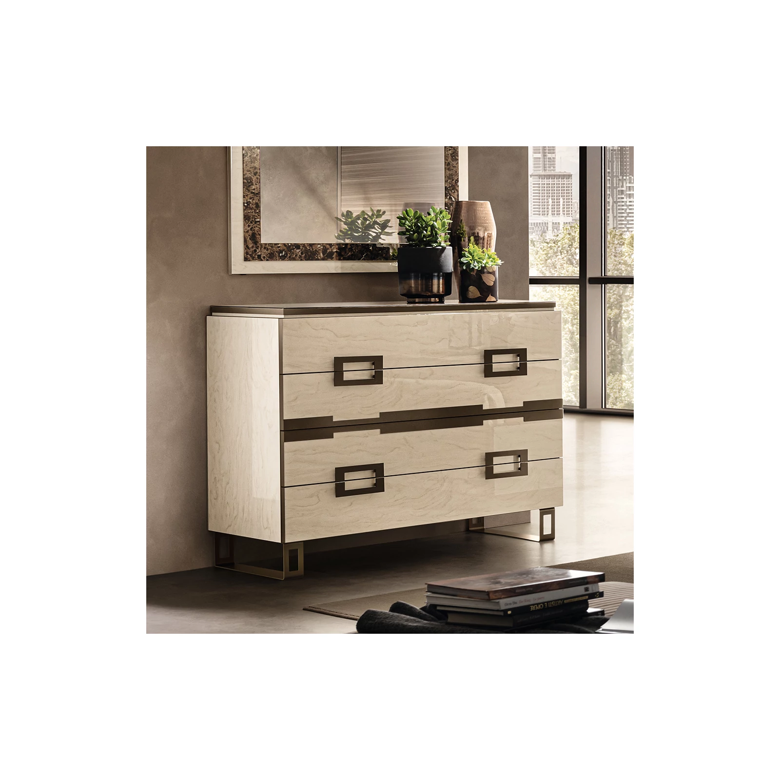 Poesia bears the signature of the Adora brand and is composed of complements designed to furnish the living room, dining room and bedroom. A refined collection in which every piece of furniture is a metaphor for Made-in-Italy beauty and elegance. Minimalist details meet sophisticated materials in a fusion of refined character. With Poesia, contemporary style acquires a new image, thanks to its attractive geometries, special finishes and contrasting materials. Emperador Dark effect screen-printed glass tops, doors in glossy beige marble finish with slight color variations, and metal handles in warm bronze shades are precious details that enrich each element and constitute the leitmotif of the entire collection. The square shapes of the furniture and seats appear linear and graceful, providing a play of volumes and softness that integrate comfort, aesthetics and functionality. Linearity, essentiality and a touch of boldness are Poesia’s stylistic hallmarks. This is where the true poetry of this collection lies: in its ability to convey the value of Italian furniture, by creating cozy and comfortable furnishing scenarios.
