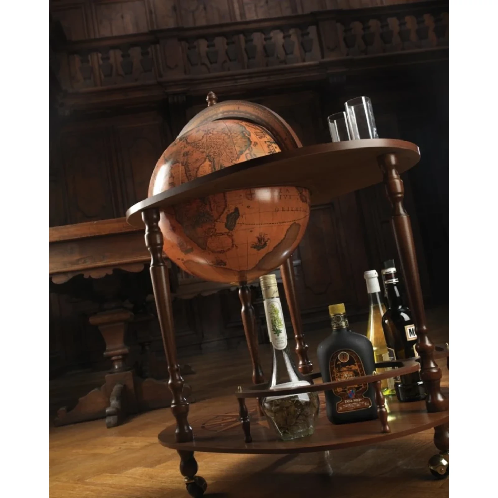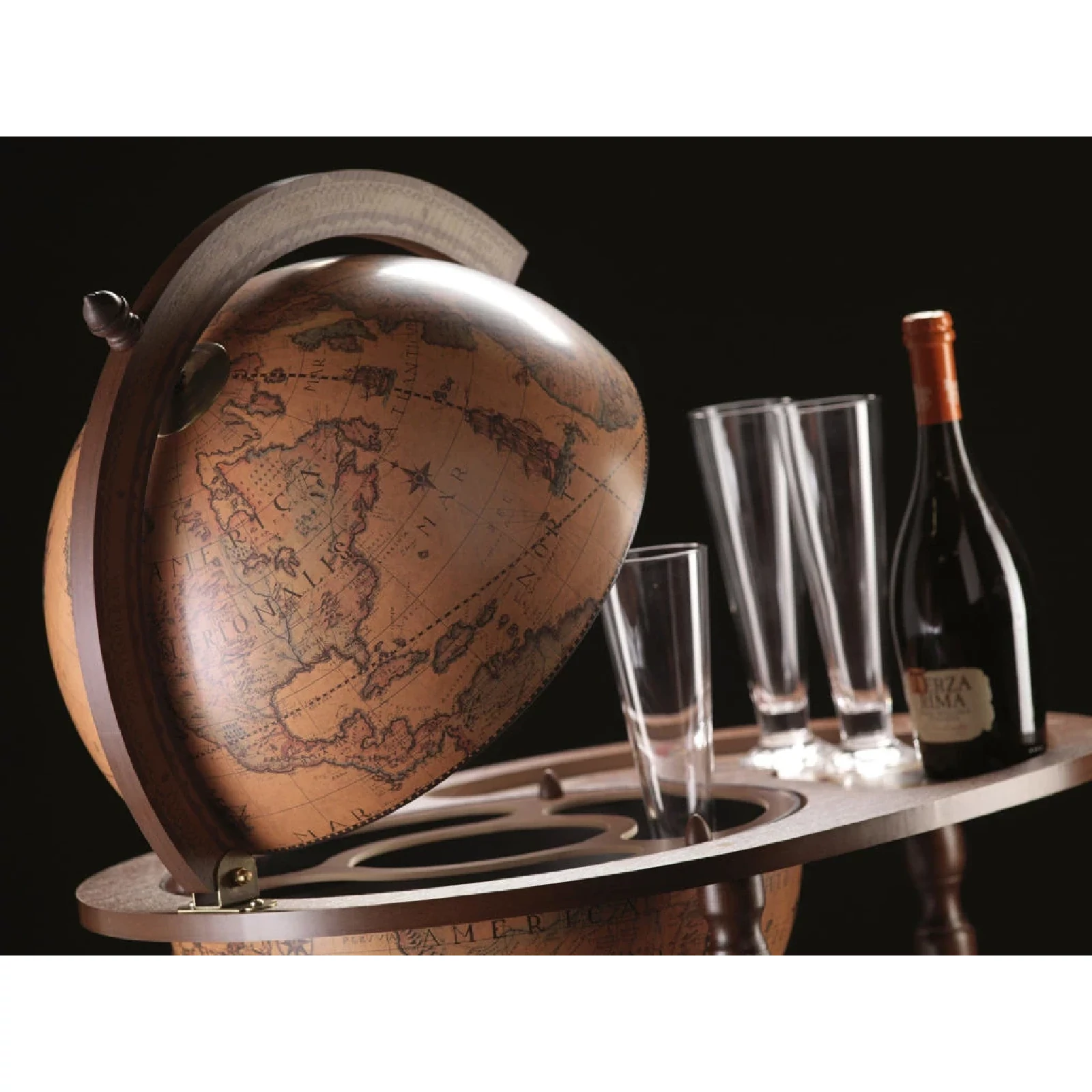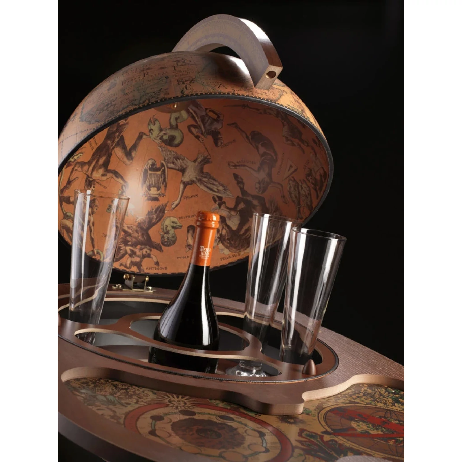Entertain your friends with this convenient bar globe which has been designed with hospitality and social life concept in mind! The upper serving tray in addition to the spacious drinks cabinet inside the globe itself, it will provide an excellent space to store bar accessories, decanters, glassware and your favourite bottles of wine and liquor. With its solid wooden base, decorated by hand-finished screen-printings, this globe is a fine addition to any room. The globe sphere, whose map is a faithful reproduction of a 16th Century cartography, fully rotates around its meridian either when it is open or closed.