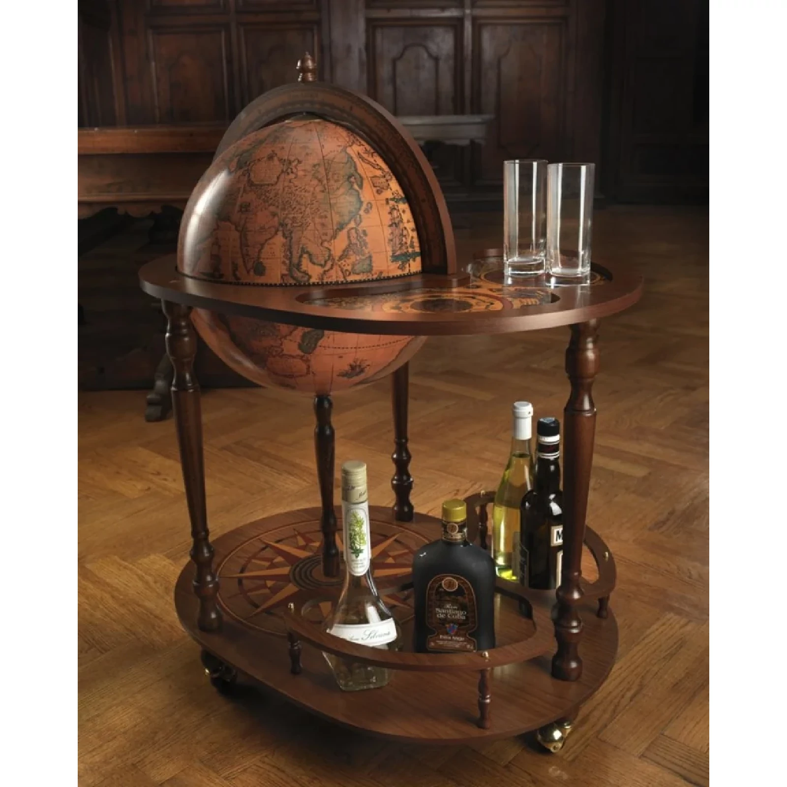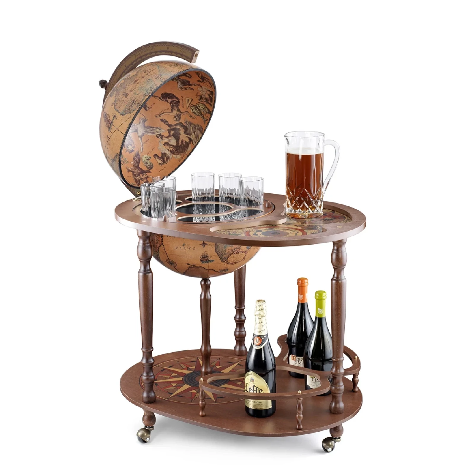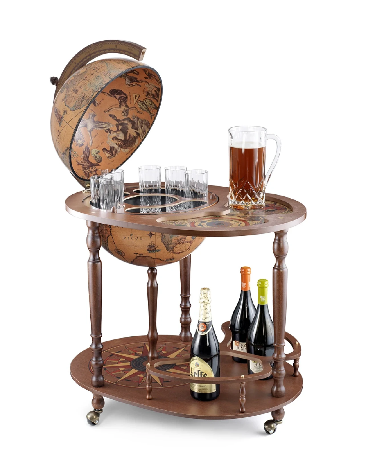 Entertain your friends with this convenient bar globe which has been designed with hospitality and social life concept in mind! The upper serving tray in addition to the spacious drinks cabinet inside the globe itself, it will provide an excellent space to store bar accessories, decanters, glassware and your favourite bottles of wine and liquor. With its solid wooden base, decorated by hand-finished screen-printings, this globe is a fine addition to any room. The globe sphere, whose map is a faithful reproduction of a 16th Century cartography, fully rotates around its meridian either when it is open or closed.
