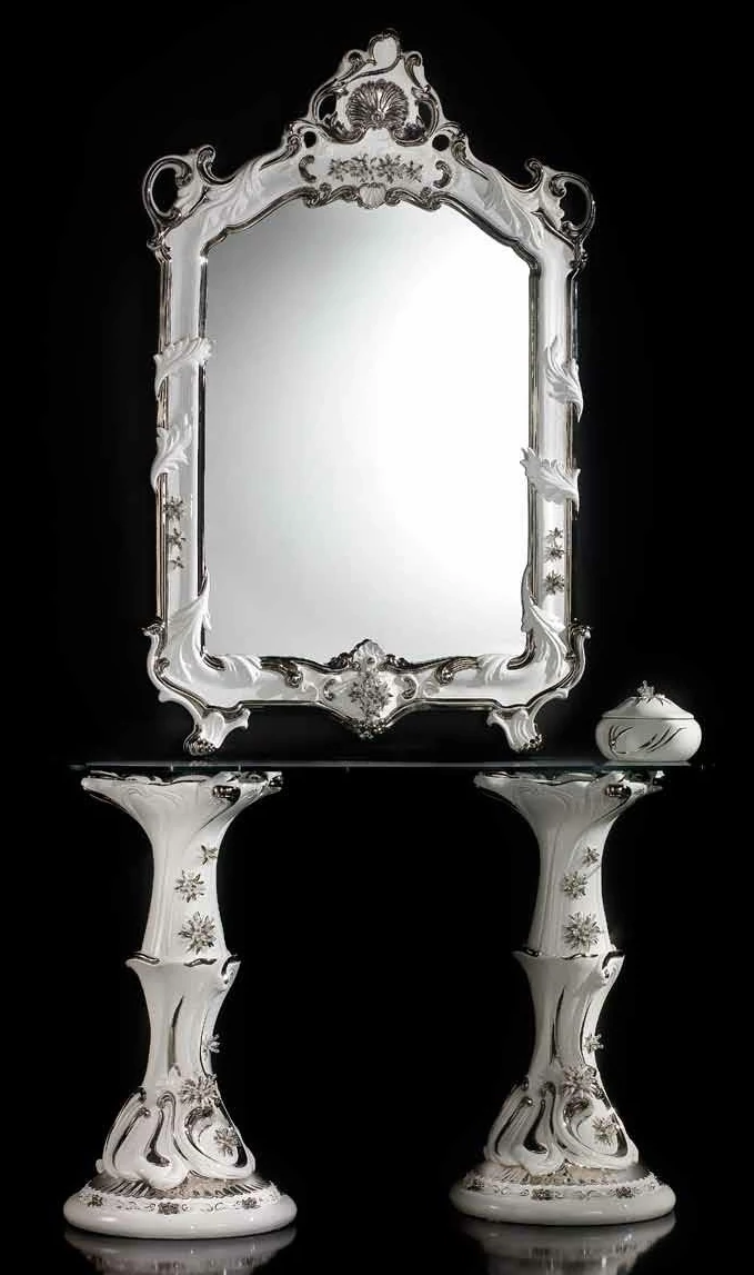 Ceramic console with 2 columns, glass, with flower sw, with mirror. Color: white, platinum
